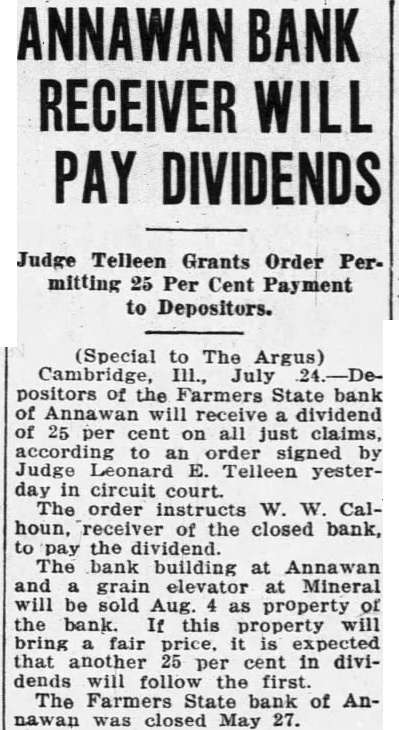 (Special to The Argus) Cambridge, III., July positors of the Farmers State bank of will receive dividend of 25 per cent on all just claims, according to order signed Judge Leonard Telleen yesterday in circuit court. The order instructs W. W. Calhoun, receiver of the closed bank, to pay the dividend. The bank building at Annawan and grain elevator at Mineral will be sold Aug. as property of the bank. If this property will bring fair price, it is expected that another 25 per cent in dividends will follow the first. The Farmers State bank of Anwas closed May 27.