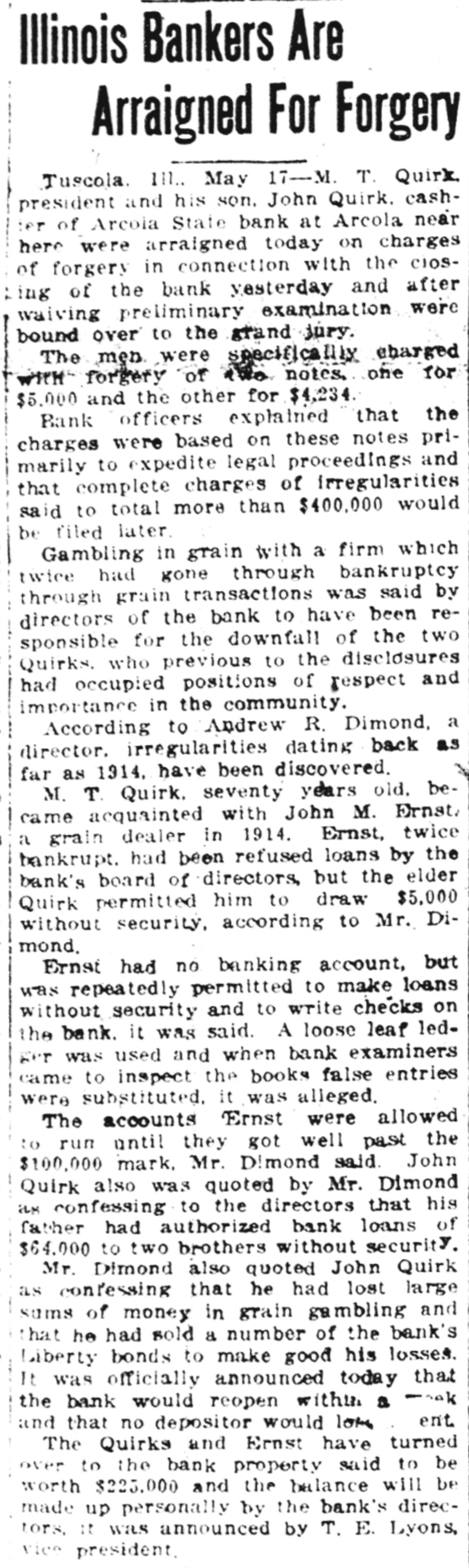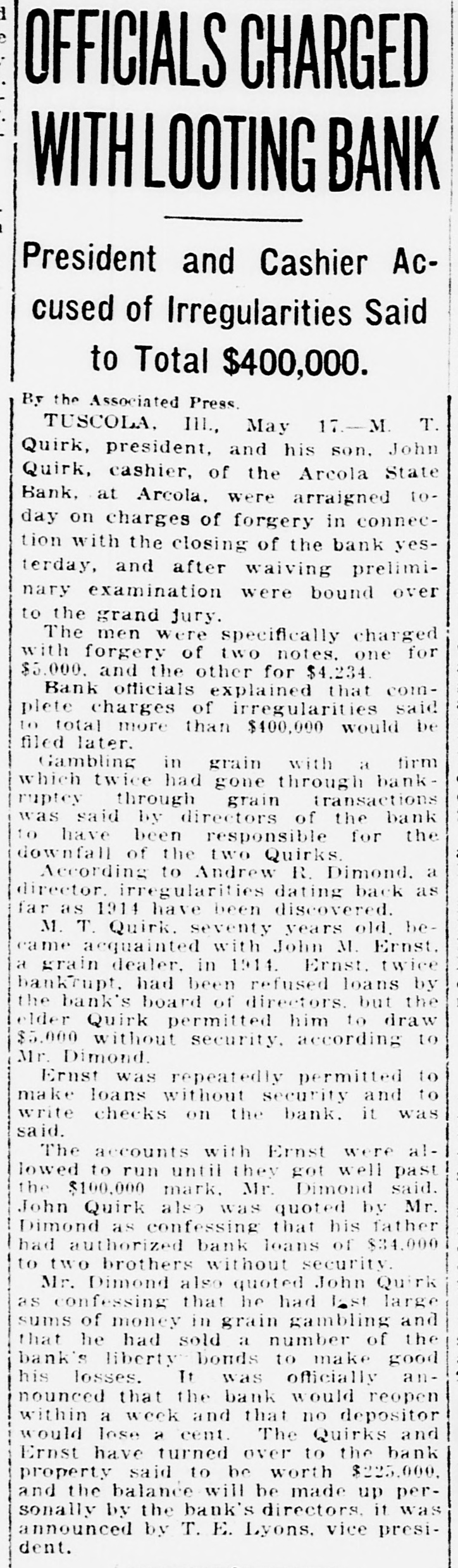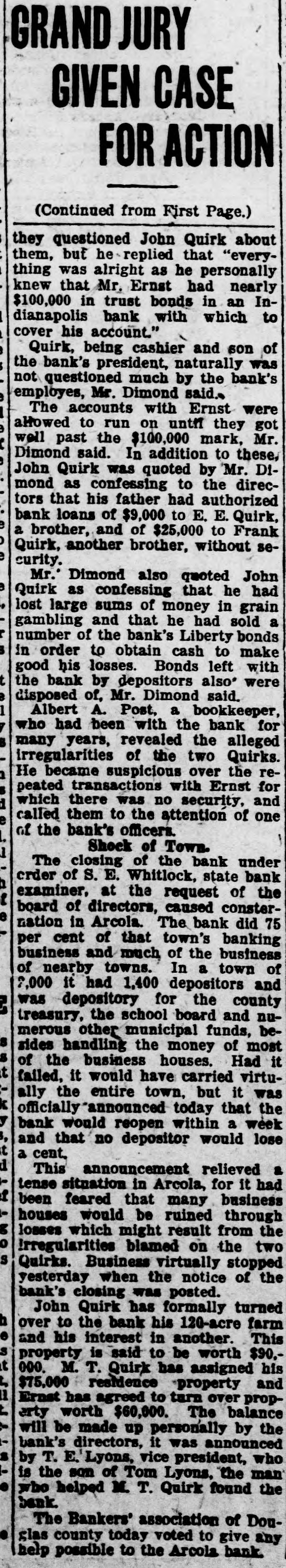 GRAND JURY GIVEN CASE FOR ACTION (Continued from First Page.) they questioned John Quirk about them, but he replied that "everything was alright as he personally knew that Mr. Ernst had nearly $100,000 in trust bonds in an Indianapolis bank with which to cover his account." Quirk, being cashier and son of the bank's president, naturally was not questioned much by the bank's employes, Mr. Dimond said. The accounts with Ernst were allowed to run on untff they got well past the $100,000 mark, Mr. Dimond said. In addition to these, John Quirk was quoted by 'Mr. Dimond as confessing to the directors that his father had authorized bank loans of $9,000 to E. E. Quirk, a brother, and of $25,000 to Frank Quirk, another brother, without security. Mr. Dimond also quoted John Quirk as confessing that he had lost large sums of money in grain gambling and that he had sold a number of the bank's Liberty bonds in order to obtain cash to make good his losses. Bonds left with the bank by depositors also were disposed of, Mr. Dimond said. Albert A. Post, a bookkeeper, who had been with the bank for many years, revealed the alleged irregularities of the two Quirks. He became suspicious over the repeated transactions with Ernst for which there was no security, and called them to the attention of one of the bank's officers. Shock of Town. The closing of the bank under crder of S. E. Whitlock, state bank examiner, at the request of the board of directors, caused consternation in Arcola. The bank did 75 per cent of that town's banking business and much of the business of nearby towns. In a town of 7,000 it had 1,400 depositors and was depository for the county treasury, the school board and numerous other municipal funds, bes sides handling the money of most of the business houses. Had it failed, it would have carried virtually the entire town, but it was k officially announced today that the y bank would reopen within a week 3, and that no depositor would lose t a cent. This announcement relieved a tense situation in Arcola, for it had been feared that many business houses would be ruined through losses which might result from the Irregularities blamed on the two S Quirks. Business virtually stopped yesterday when the notice of the bank's closing was posted. John Quirk has formally turned h over to the bank his 120-acre farm e and his interest in another. This s property is said to be worth $90.t 000. M. T. Quirk has assigned his $75,000 residence property and 11 Ernst has agreed to turn over proparty worth $60,000. The balance will be made up personally by the bank's directors, it was announced by T. E. Lyons, vice president, who is the son of Tom Lyons, the man who helped M. T. Quirk found the bank. The Bankers' association of Douglas county today voted to give any help possible to the Arcola bank