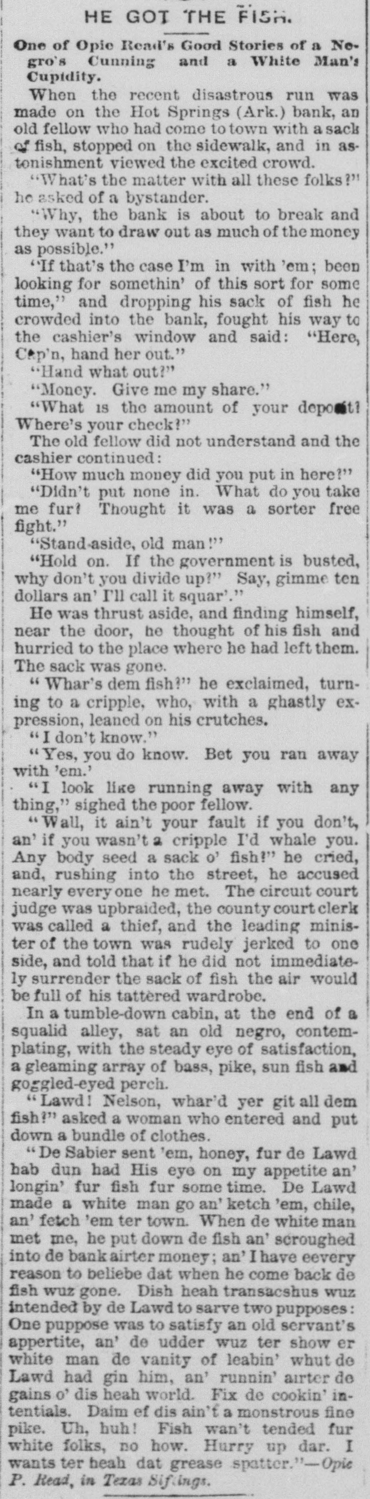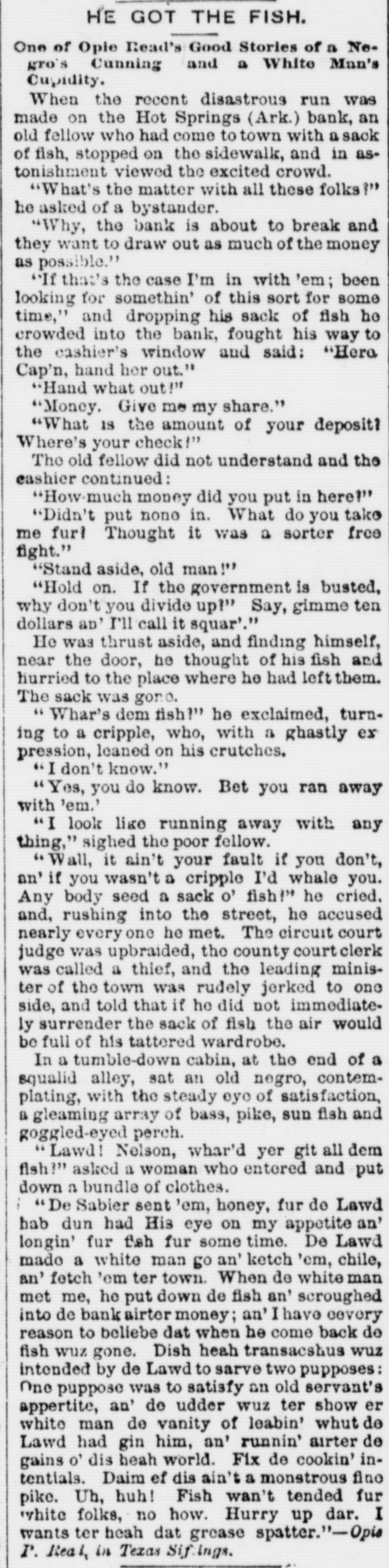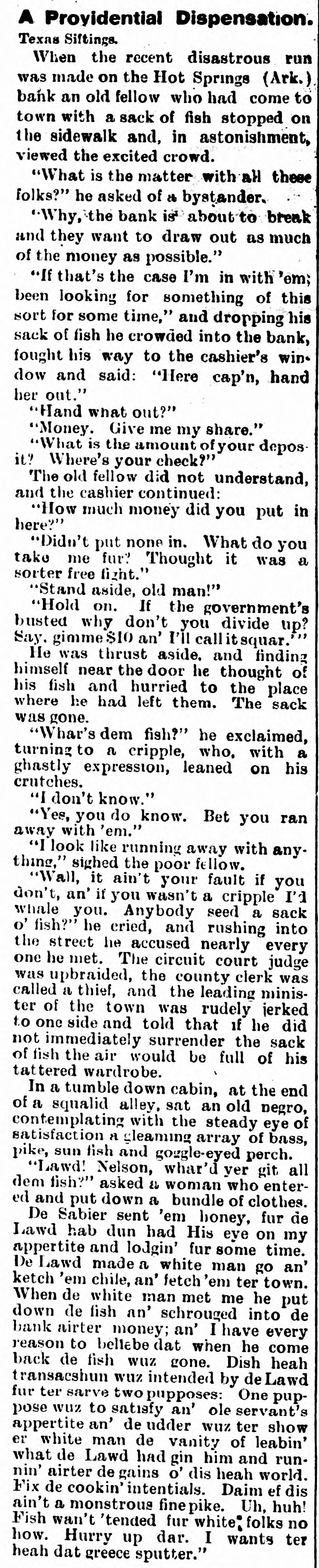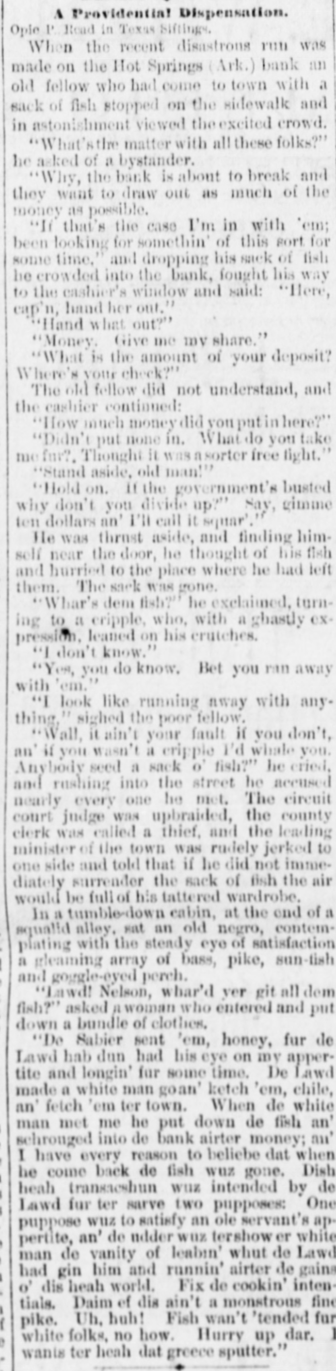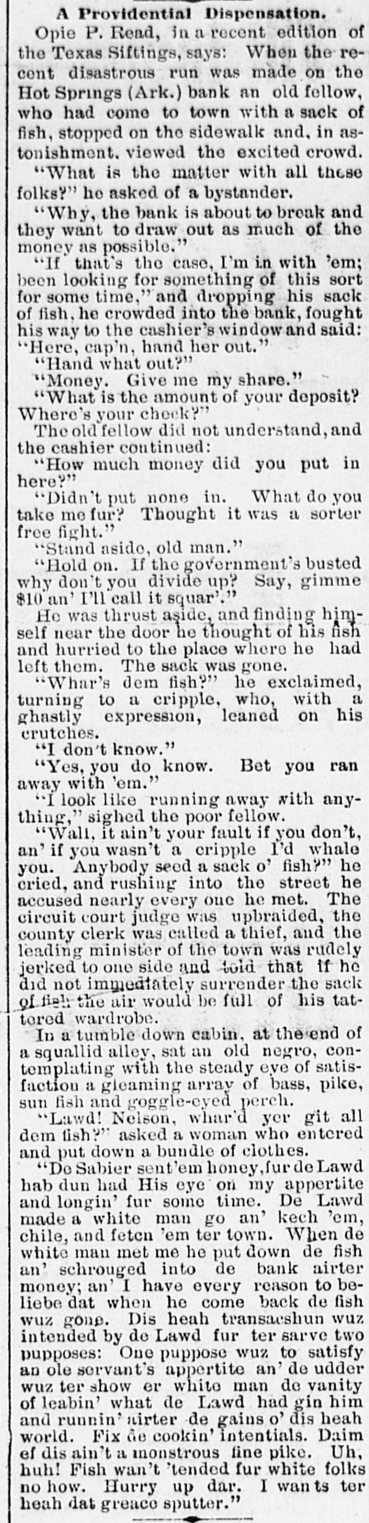 A Providential Dispensation. Opie P. Read in Texas Siftings. When the recent disastrons run was made on the Hot Springs (Ark.) bank an old fellow who had come to town with a sack of fish stopped on the sidewalk and in astonishment viewed the excited crowd. "What'sthe matter with all these folks?" he asked of a bystander. "Why, the bank is about to break and they want to draw out as much of the money as possible. "If that's the case I'm in with "em; been looking for somethin' of this sort for some time," and dropping his sack of fish he crowded into the bank, fought his way to the cashier's window and said: "Here, cap'n, hand her out." "Hand what out?" "Money. Give me my share." "What is the amount of your deposit? Where's your check?" The old fellow did not understand, and the cashier continued: "How much money did you put in here?" "Didn't put none in. What do you take fur?. Thought it Was a sorter free fight." "Stand aside, old man!" "Hold on. If the government's busted why don't you divide up?" Say, gimme ten dollars an' I'll call it squar'." He was thrust aside, and finding himself near the door, he thought of his fish and hurried to the place where he had left them. The sack was gone. "Whar's dem fish?" he exclaimed, turning to a cripple, who, with a ghastly expression, leaned on his crutches. "I don't know." "Yes, you do know. Bet you ran away with 'em." "I look like running away with anything,' sighed the poor fellow. "Wall, it ain't your fault if you don't, an' if you wasn't a cripple I'd whale you. Anybody seed a sack o' fish?" he cried, and rushing into the street he accused nearly every one he met. The circuit court judge was upbraided, the county clerk was called a thief, and the leading minister of the town was rudely jerked to one side and told that if he did not immediately surrender the sack of fish the air would be fullo of his tattered wardrobe. In a tumble-down cabin, at the end of a squalid alley, sat an old negro, contemplating with the stendy eye of satisfaction a gleaming array of bass, pike, sun-tish and goggle-eyed perch. "Lawd! Nelson, whar'd yer git all dem fish?" asked R woman who entered and put down a bundle of clothes. "De Sabier sent 'em, honey, fur de Lawd hab dun had his eye on my appertite and longin' for some time. De Lawd made a white man goan' ketch 'em, chile, an' fetch 'em ter town. When de white man met me he put down de fish an' schrouged into de bank airter money; an' I have every reason to beliebe dat when he come back de fish wuz gone. Dish heah transacshun wuz intended by de Lawd fur ter sarve two pupposes: One puppose wuz to satisfy an ole servant's appertite, an' de udder wuz tershow er white man de vanity of leabin' whut de Lawd had gin him and runnin' airter de gains