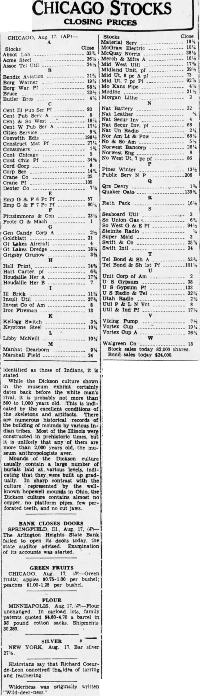 CHICAGO STOCKS CLOSING PRICES identified as those of Indians, it While the Dickson culture shown exhibit certainly dates back before the white man's rival, probably not more than 500 to 1,000 years old. This indicated by the excellent conditions the skeletons artifacts. There are numerous historical records the building mounds various Indian tribes. Most of the Illinois constructed prehistoric times, them are than years old, the muMounds the Dickson culture usually burials laid various levels. cating that they built ually. In sharp with the culture represented by the wellknown hopewell mounds Ohio, the Dickson culture almost copper, no platform pipes, perforated and cut BANK CLOSES DOORS The Arlington Heights Bank failed to doors the auditor Examination accounts was started. GREEN FRUITS CHICAGO. fruits; apples per bushel; peaches $1.00-1.25 per bushel. FLOUR unchanged. In carload lots, family patents quoted barrel in pound cotton sacks Shipments SILVER NEW YORK, Aug. 17. Bar silver Historians say that Richard Coeurconceived tarring and feathering Wilderness was originally written Stocks Close CHICAGO, Aug Material Serv 18% Close McGraw Electric 10% Stocks 33% McQuay Norris Abbot Merch Mfrs Acme West 17% Assoc Tel Util Midland Unit, Mid 73 Bendix Aviation 21% 19% Mid 92% Borg Warner Mo Kans Pipe 4½ Borg Modine Bruce 4% Morgan Litho Butler Bros Nat Battery 32 Ser 93 Nat Leather Pub 16% Nat Secur Inv Nat Secur pf Cent Pub Ser Nat Un Radio Cities Service Nor Pow Comwith No So Am Construct Pf Norwest Bancorp Consumers 1% Norwest Eng Cont Chicago West 86 Cont Chic 34% Cord Corp Pines Winter Corp Sec 14% Public Serv Crane Co 25 Q Crane Qrs Devry 1% Dexter Co 7½ Quaker Oats 139% 57 Rath Pack Emp Seaboard Util Fitzsimmons Con Union 6% Foote Mach West G Steinite Radio Gen Candy Corp 2½ 21 Super Maid Goldblatt Swift 25% Gt Lakes Aircraft Swift Intl 34 Gt Lakes Dredge Grigsby Grunow 3% H Tel Bond Sh 53% Hall 14% Bond Sh Pf Hart Carter. pf 6% Houdaille Her Unit Corp of Am Houdaille Her Gypsum 38 Gypsum Pf 133 Ill Brick Radio Tel Insull Util Utah Radio Invest Am Vot Iron Fireman 13 Util Ind Pf Kellogg Switch 3% Viking Pump Vortex Keystone Steel Vortex Cup A 26% Libby McNeill 10% Walgreen Co Manhat Dearborn 9½ Stock sales today 82,000 shares. Marshall Field 24 Bond sales today $24,000.