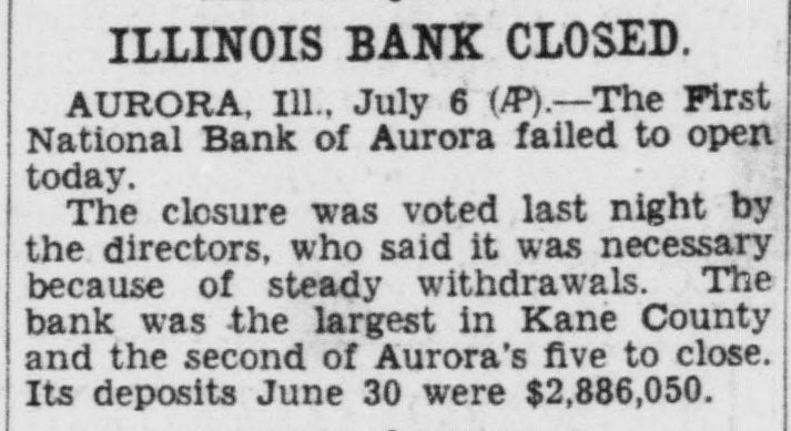 ILLINOIS BANK CLOSED. AURORA, Ill., July 6 (AP).-The - First National Bank of Aurora failed to open today. The closure was voted last night by the directors, who said it was necessary because of steady withdrawals. The bank was the largest in Kane County and the second of Aurora's five to close. Its deposits June 30 were $2,886,050.