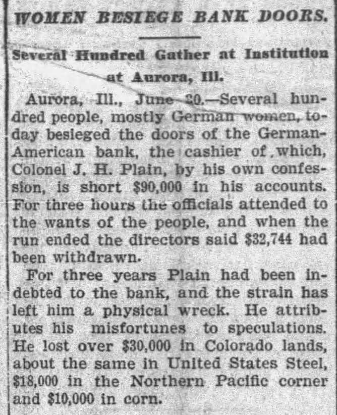 WOMEN BESIEGE BANK DOORS. Several Hundred Gather at Institution at Aurora, III. Aurora, III., June CO.-Several hundred people, mostly German women, today besieged the doors of the GermanAmerican bank, the I cashier of, which, Colonel J. H. Plain, by his own confession, is short $90,000 in his accounts. For three hours the officials attended to the wants of the people, and when the run ended the directors said $32,744 had been withdrawn. For three years Plain had been indebted to the bank, and the strain has left him a physical wreck. He attributes his misfortunes to speculations. He lost over $30,000 in Colorado lands, about the same in United States Steel, $18,000 in the Northern Pacific corner and $10,000 in corn.