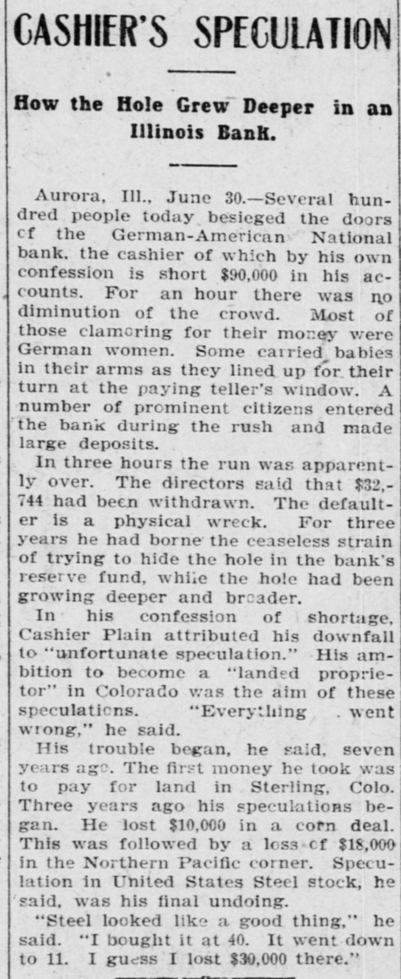 GASHIER'S SPECULATION How the Hole Grew Deeper in an Illinois Bank. Aurora, Ill., June 30. -Several hundred people today besieged the doors of the German-American National bank. the cashier of which by his own confession is short $90,000 in his accounts. For an hour there was no diminution of the crowd. Most of those clamering for their money were German women. Some carried babies in their arms as they lined up for their turn at the paying teller's window. A number of prominent citizens entered the bank during the rush and made large deposits. In three hours the run was apparently over. The directors said that $32,744 had been withdrawn. The defaulter is a physical wreck. For three years he had borne the ceaseless strain of trying to hide the hole in the bank's reserve fund, while the hole had been growing deeper and breader. In his confession of shortage, Cashier Plain attributed his downfall to "unfortunate speculation." His ambition to become a "landed proprietor" in Colorado was the aim of these speculations. "Everything went wrong," he said. His trouble began, he said, seven years ago. The first money he took was to pay for land in Sterling, Colo. Three years ago his speculations began. He lost $10,000 in a corn deal. This was followed by a loss of $18,000 in the Northern Pacific corner. Speculation in United States Steel stock, he said, was his final undoing. "Steel looked like a good thing," he said. "I bought it at 40. It went down to 11. I guess I lost $30,000 there."