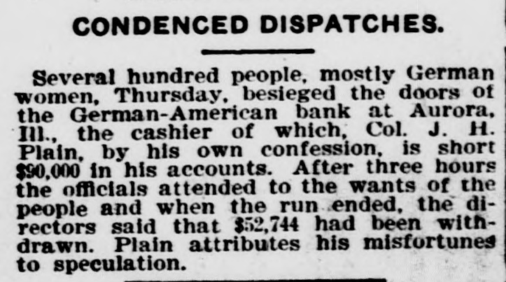 CONDENCED DISPATCHES. Several hundred people, mostly German women, Thursday, besieged the doors of the German-American bank at Aurora, III., the cashier of which, Col. J. H. Plain, by his own confession, is short $90,000 in his accounts. After three hours the officials attended to the wants of the people and when the run ended, the directors said that $52,744 had been withdrawn. Plain attributes his misfortunes to speculation.