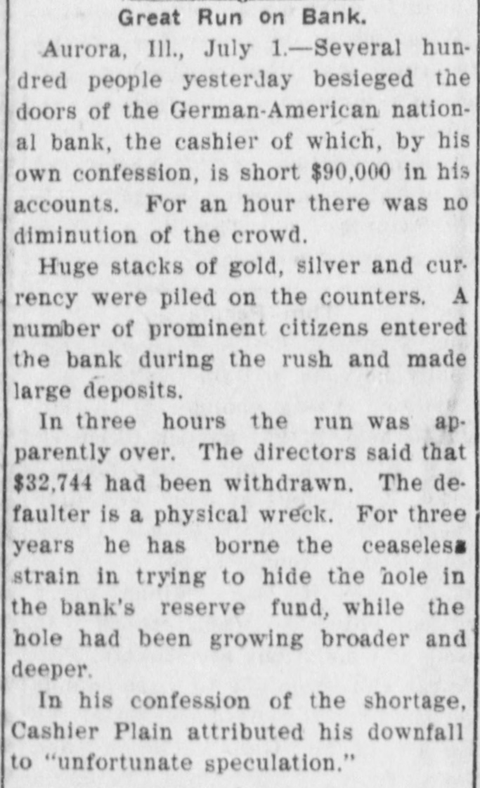Great Run on Bank. Aurora, Ill., July 1.-Several hundred people yesterday besieged the doors of the German-American national bank, the cashier of which, by his own confession, is short $90,000 in his accounts. For an hour there was no diminution of the crowd. Huge stacks of gold, silver and currency were piled on the counters. A number of prominent citizens entered the bank during the rush and made large deposits. In three hours the run was apparently over. The directors said that $32,744 had been withdrawn. The defaulter is a physical wreck. For three years he has borne the ceaseles strain in trying to hide the hole in the bank's reserve fund, while the hole had been growing broader and deeper. In his confession of the shortage, Cashier Plain attributed his downfall to "unfortunate speculation."