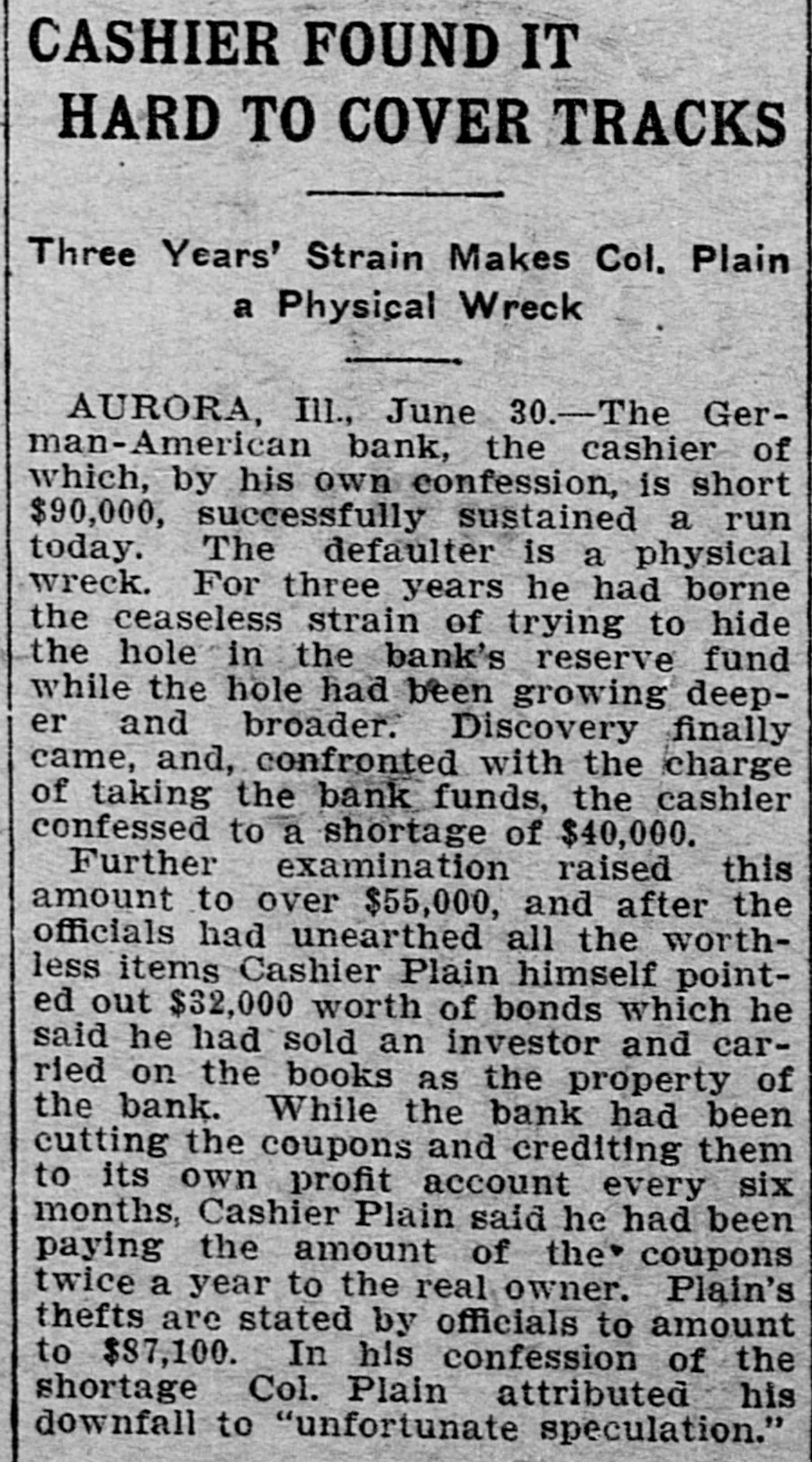 CASHIER FOUND IT HARD TO COVER TRACKS Three Years' Strain Makes Col. Plain a Physical Wreck I AURORA, Ill., June 30.-The German-American bank, the cashier of which, by his own confession, is short $90,000, successfully sustained a run today. The defaulter is a physical wreck. For three years he had borne the ceaseless strain of trying to hide the hole in the bank's reserve fund while the hole had been growing deeper and broader. Discovery finally came, and, confronted with the charge of taking the bank funds, the cashier confessed to a shortage of $40,000. Further examination raised this amount to over $55,000, and after the officials had unearthed all the worthless items Cashier Plain himself pointed out $32,000 worth of bonds which he said he had sold an investor and carried on the books as the property of the bank. While the bank had been cutting the coupons and crediting them to its own profit account every six months, Cashier Plain said he had been paying the amount of the* coupons twice a year to the real owner. Plain's thefts are stated by officials to amount to $87,100. In his confession of the shortage Col. Plain attributed his downfall to "unfortunate speculation."