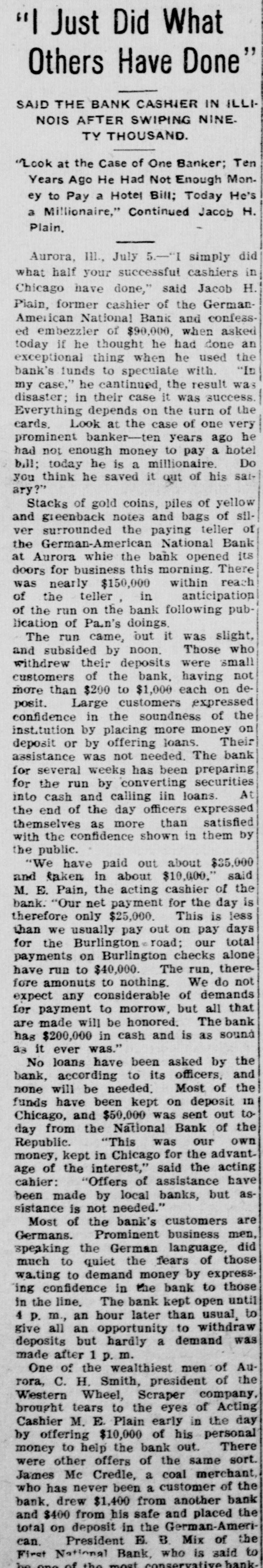 Just Did What Others Have Done' SAID THE BANK CASHIER IN ILLI NOIS AFTER SWIPING NINE. TY THOUSAND. Look at the Case of One Banker; Ten Years Ago He Had Not Enough Mon. ey to Pay a Hotel Bill: Today He's a Millionaire," Continued Jacob H. Plain. Aurora, III., July 5.-"I simply did what half your successful cashiers in Chicago have done," said Jacob H. Plain, former cashier of the GermanAmerican National Bank and confessed embezzler of $90,000. when asked today if he thought he had done an exceptional thing when he used the bank's funds to speculate with. "In my case," he cantinued, the result was disaster: in their case it was success. Everything depends on the turn of the cards. Look at the case of one very prominent banker-ten years ago he had not enough money to pay a hotel bill; today he is a millionaire. Do you think he saved it out of his saiary?" Stacks of gold coins, piles of yellow and greenback notes and bags of silver surrounded the paying teller of the German-American National Bank at Aurora whie the bank opened its doors for business this morning. There was nearly $150,000 within reach of the teller in anticipation of the run on the bank following publication of Pa.n's doings. The run came, but it was slight, and subsided by noon. Those who withdrew their deposits were small customers of the bank, having not more than $200 to $1,000 each on deposit. Large customers expressed confidence in the soundness of the institution by placing more money on deposit or by offering loans. Their assistance was not needed. The bank for several weeks has been preparing for the run by converting securities into cash and calling iin loans. At the end of the day officers expressed themselves as more than satisfied with the confidence shown in them by the public. "We have paid out about $35,000 and taken in about $10,000," said M. E. Pain, the acting cashier of the bank. "Our net payment for the day is therefore only $25,000. This is less than we usually pay out on pay days for the Burlington road; our total payments on Burlington checks alone have run to $40,000. The run, therefore amonuts to nothing. We do not for to morrow, expect payment any considerable but of demands all that are made will be honored. The bank hag $200,000 in cash and is as sound as it ever was." No loans have been asked by the bank, according to its officers, and none will be needed. Most of the funds have been kept on deposit in Chicago, and $50,000 was sent out to day from the National Bank of the "This was our own Republic. money, kept in Chicago for the advant. age of the interest," said the acting cahier: "Offers of assistance have been made by local banks, but assistance is not needed." Most of the bank's customers are Germans. Prominent business men, speaking the German language, did much to quiet the fears of those wa.ting to demand money by express`ing confidence in the bank to those in the line. The bank kept open until 4 p. m., an hour later than usual, to give all an opportunity to withdraw deposits but hardly a demand was made after 1 p. m. One of the wealthiest men of Aurora, C. H. Smith, president of the Western Wheel, Scraper company. the brought Cashier M. tears E. to Plain early eyes in of the Acting day by offering $10,000 of his personal money to help the bank out. There were other offers of the same sort. James Mc Credle, a coal merchant, who has never been a customer of the bank. drew $1,400 from another bank and $400 from his safe and placed the total on deposit in the German-American. President E. B. Mix of the First National Bank, who is said to he one of the most conservative bank-