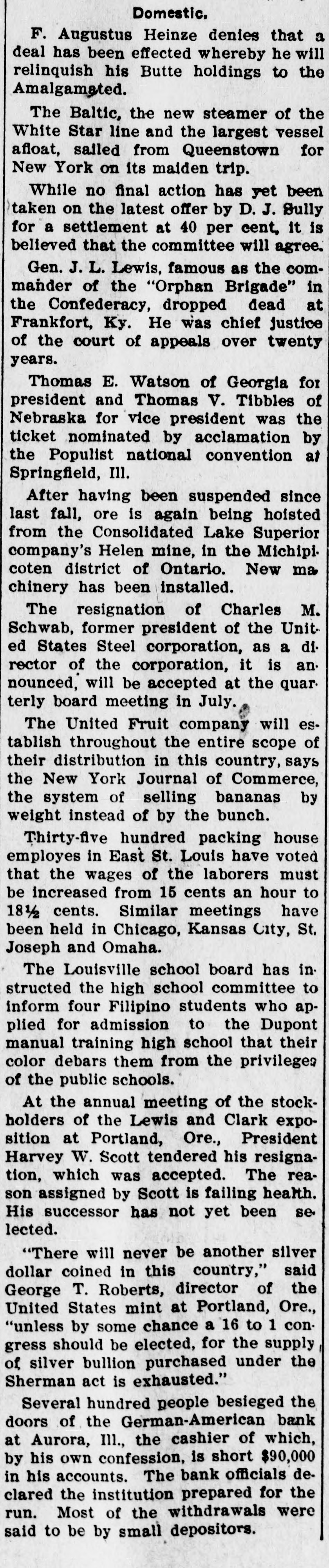 Domestic. F. Augustus Heinze denies that a deal has been effected whereby he will relinquish his Butte holdings to the Amalgamated. The Baltic, the new steamer of the White Star line and the largest vessel afloat, sailed from Queenstown for New York on its maiden trip. While no final action has yet been taken on the latest offer by D. J. Bully for a settlement at 40 per cent, it is believed that the committee will agree. Gen. J. L. Lewis, famous as the commander of the "Orphan Brigade" in the Confederacy, dropped dead at Frankfort, Ky. He was chief justice of the court of appeals over twenty years. Thomas E. Watson of Georgia for president and Thomas V. Tibbles of Nebraska for vice president was the ticket nominated by acclamation by the Populist national convention at Springfield, III. After having been suspended since last fall, ore is again being hoisted from the Consolidated Lake Superior company's Helen mine, in the Michipicoten district of Ontario. New ma chinery has been installed. The resignation of Charles M. Schwab, former president of the United States Steel corporation, as a director of the corporation, it is announced, will be accepted at the quar. terly board meeting in July. The United Fruit company will establish throughout the entire scope of their distribution in this country, says the New York Journal of Commerce, the system of selling bananas by weight instead of by the bunch. Thirty-five hundred packing house employes in East St. Louis have voted that the wages of the laborers must be increased from 15 cents an hour to 18½ cents. Similar meetings have been held in Chicago, Kansas City, St. Joseph and Omaha. The Louisville school board has in. structed the high school committee to inform four Filipino students who applied for admission to the Dupont manual training high school that their color debars them from the privileges of the public schools. At the annual meeting of the stockholders of the Lewis and Clark exposition at Portland, Ore., President Harvey W. Scott tendered his resignation, which was accepted. The reason assigned by Scott is failing health. His successor has not yet been se. lected. "There will never be another silver dollar coined in this country," said George T. Roberts, director of the United States mint at Portland, Ore., "unless by some chance a 16 to 1 congress should be elected, for the supply of silver bullion purchased under the Sherman act is exhausted." Several hundred people besieged the doors of the German-American bank at Aurora, III., the cashier of which, by his own confession, is short $90,000 in his accounts. The bank officials declared the institution prepared for the run. Most of the withdrawals were said to be by small depositors.