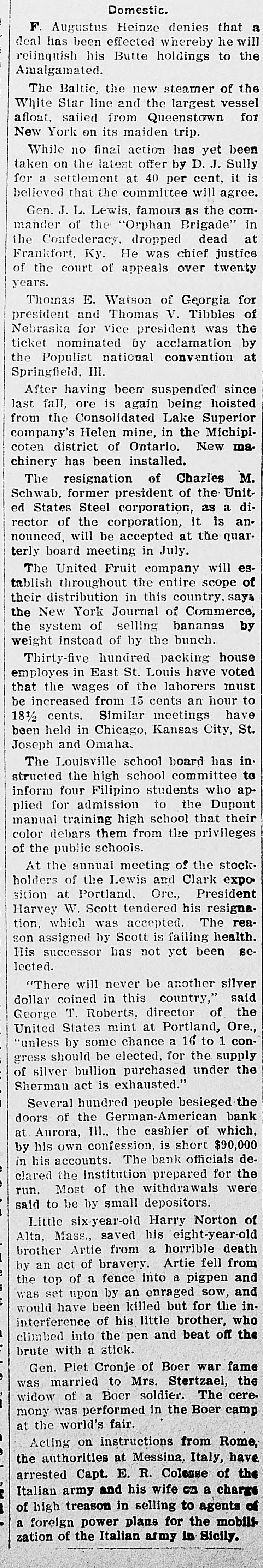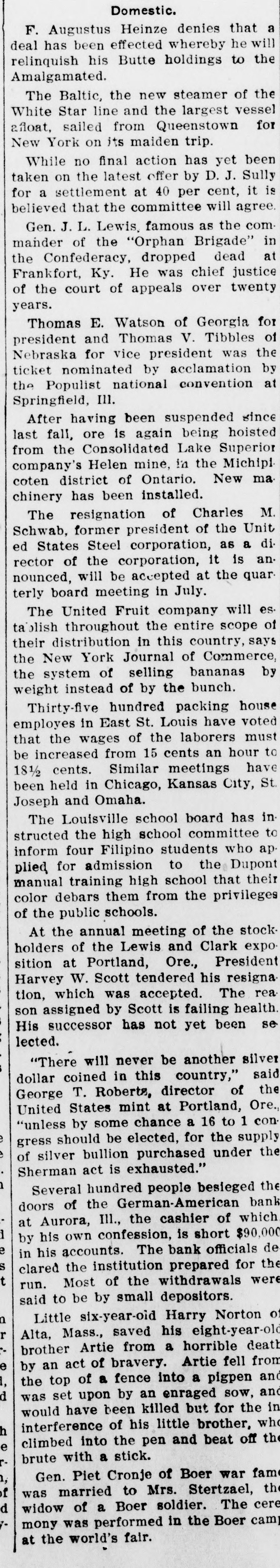 Domestic. F. Augustus Heinze denies that a deal has been effected whereby he will relinquish his Butte holdings to the Amalgamated. The Baltic, the new steamer of the White Star line and the largest vessel afloat, sailed from Queenstown for New York on its maiden trip. While no final action has yet been taken on the latest offer by D. J. Sully for a settlement at 40 per cent, it is believed that the committee will agree. Gen. J. L. Lewis, famous as the commander of the "Orphan Brigade" in the Confederacy, dropped dead at Frankfort, Ky. He was chief justice of the court of appeals over twenty years. Thomas E. Watson of Georgia for president and Thomas V. Tibbles of Nebraska for vice president was the ticket nominated by acclamation by the Populist national convention at Springfield, Ill. After having been suspended since last fall, ore is again being hoisted from the Consolidated Lake Superior company's Helen mine, in the Michipi coten district of Ontario. New ma. chinery has been installed. The resignation of Charles M. Schwab, former president of the Unit ed States Steel corporation, as a director of the corporation, it is announced, will be accepted at the quarterly board meeting in July. The United Fruit company will es. tablish throughout the entire scope of their distribution in this country, says the New York Journal of Commerce, the system of selling bananas by weight instead of by the bunch. Thirty-five hundred packing house employes in East St. Louis have voted that the wages of the laborers must be increased from 15 cents an hour to 18½ cents. Similar meetings have been held in Chicago, Kansas City, St. Joseph and Omaha. The Louisville school board has instructed the high school committee to inform four Filipino students who ap. plied for admission to the Dupont manual training high school that their color debars them from the privileges of the public schools. At the annual meeting of the stockholders of the Lewis and Clark exposition at Portland, Ore., President Harvey W. Scott tendered his resigna tion, which was accepted. The rea son assigned by Scott is failing health. His successor has not yet been se lected. "There will never be another silver dollar coined in this country," said George T. Roberts, director of the United States mint at Portland, Ore., "unless by some chance a 16 to 1 congress should be elected, for the supply of silver bullion purchased under the Sherman act is exhausted." Several hundred people besieged the doors of the German-American bank at Aurora, III., the cashier of which by his own confession, is short $90,000 in his accounts. The bank officials de clared the institution prepared for the t run. Most of the withdrawals were said to be by small depositors. Little six-year-oid Harry Norton of n r Alta, Mass., saved his eight-year-old brother Artie from a horrible death e by an act of bravery. Artie fell from the top of a fence into a pigpen and d was set upon by an enraged sow, and would have been killed but for the in interference of his little brother, who climbed into the pen and beat off the e brute with a stick. Gen. Piet Cronje of Boer war fame f was married to Mrs. Stertzael, the widow of a Boer soldier. The cere d mony was performed in the Boer camp at the world's fair.