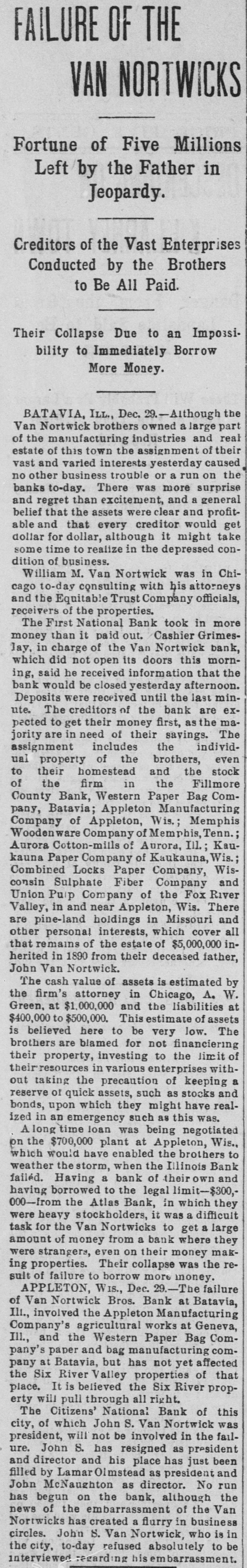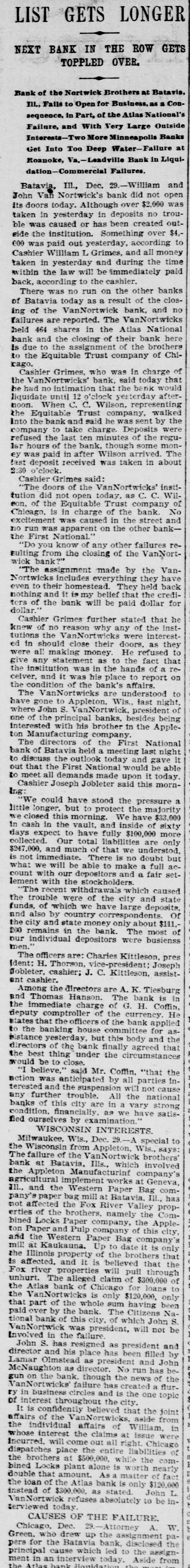 LIST GETS LONGER NEXT BANK IN THE ROW GETS TOPPLED OVER. Bank of the Nortwick Brothers at Batavia, III., Fails to Open for Business, as a Consequence, in Part, of the Atlas National's Failure, and With Very Large Outside Interests-Two More Minneapolis Banks Get Into Too Deep Water-Fallure at Roanoke, Va,-Leadville Bank in Liquidation-Commercial Failures. Batavia, Ill., Dec. 29.-William and John Van Nortwick's bank did not open its doors today. Although over $2,000 was taken in yesterday in deposits no trouble was caused or has been created outside the institution. Something over $4,000 was paid out yesterday, according to Cashier William L Grimes, and all money taken in yesterday and during the time within the law will be immediately paid back, according to the cashier. There was no run on the other banks of Batavia today as a result of the closing of the VanNortwick bank, and no failures are reported. The VanNortwicks held 464 shares in the Atlas National bank and the closing of their bank here Is due to the assignment of the brothers to the Equitable Trust company of Chirago. Cashier Grimes, who was in charge of the VanNortwicks' bank, said today that be had no intimation that the bank would liquidate until 12 o'clock yesterday afternoon. When C. C. Wilson, representing the Equitable Trust company, walked Into the bank and said he was sent by the company to take charge. Deposits were refused the last ten minutes of the regular hours of the bank, though some money was paid in after Wilson arrived. The tast deposit received was taken in about 2:30 o'clock. Cashier Grimes said: "The doors of the VanNortwicks' institution did not open today, as C. C. Wilson, of the Equitable Trust company of Chicago, is in charge of the bank. No excitement was caused in the street and no run was apparent on the other bankthe First National." "Do you know of any other failures reBulting from the closing of the VanNortwick bank?" "The assignment made by the VanNortwicks includes everything they have even to their homestead. They held back nothing and It is my belief that the crediters of the bank will be paid dollar for dollar." Cashier Grimes further stated that he knew of no reason why any of the insttutions the VanNortwicks were interested in should close their doors, as they were all making money. He refused to give any statement as to the fact that the institution was in the hands of a receiver, and it was his place to report on the condition of the bank's affairs. The VanNortwicks are understood to have gone to Appleton, Wis., last night, where John S. VanNortwick, president of one of the principal banks, besides being interested with his brother in the Appleton Manufacturing company. The directors of the First National bank of Batavia held a meeting last night to discuss the outlook today and gave it out that the First National would be able to meet all demands made upon it today. Cashier Joseph Jobleter said this mornIng: "We could have stood the pressure a little longer, but to protect the majority we closed this morning. We have $33,000 in cash in the vault, and inside of sixty days expect to have fully $100,000 more collected. Our total liabilities are only $247,000, and much of that we understod, is not immediate. There is no doubt but what we will be able to make a full account with our depositors and a fair setlement with the stockholders. "The recent withdrawals which caused the trouble were of the city and state funds, of which we have large deposits, and also by country correspondents. Of the city and state money only about $111,200 remains in the bank. The most of our individual depositors were busienss men." The officers are: Charles Kittleson, pres Ident: H. Thorson, vice-president; Joseph Jobleter, cashier; J. C. Kittleson, assistant cashier. Among the directors are A. K. Tiesburg and Thomas Hanson. The bank is in the immediate charge of G. H. Coffin, deputy comptroller of the currency. He states that the officers of the bank applied to the banking house committee for assistance yesterday, but this body and the directors of the bank finally agreed that the best thing under the circumstances would be to close. "I believe," said Mr. Coffin, "that the action was anticipated by all parties interested and the suspension will not cause any further trouble. All the national banks of this city are in a vary strong condition. financially, as we have satisfied ourselves by examination." WISCONSIN INTERESTS. Milwaukee, Wis., Dec. 29.-A special to the Wisconsin from Appleton, Wis., says: The failure of the VanNortwick brothers' bank at Batavia, Ills., which involved the Appleton Manufacturinf company's agricultural implement works at Geneva, III., and the Western Paper Bag company's paper bag mill at Batavia, III., has not affected the Fox River Valley properties of the brothers, namely the Combined Locks Paper company, the Appleton Paper and Pulp company of this city, and the Western Paper Bag company S mill at Kaukauna. Up to date it is only the Illinois property of the brothers that is affected, and it is believed that the Fox river properties will pull through unhurt. The alleged claim of $300.000 of the Atlas bank of Chicago for loans to the VanNortwicks is only $120,000, only that part of the whole sum having been paid over by the bank. The Citizens National bank of this city, of which John S. VanNortwick was president, will not be