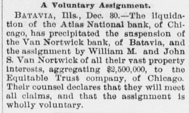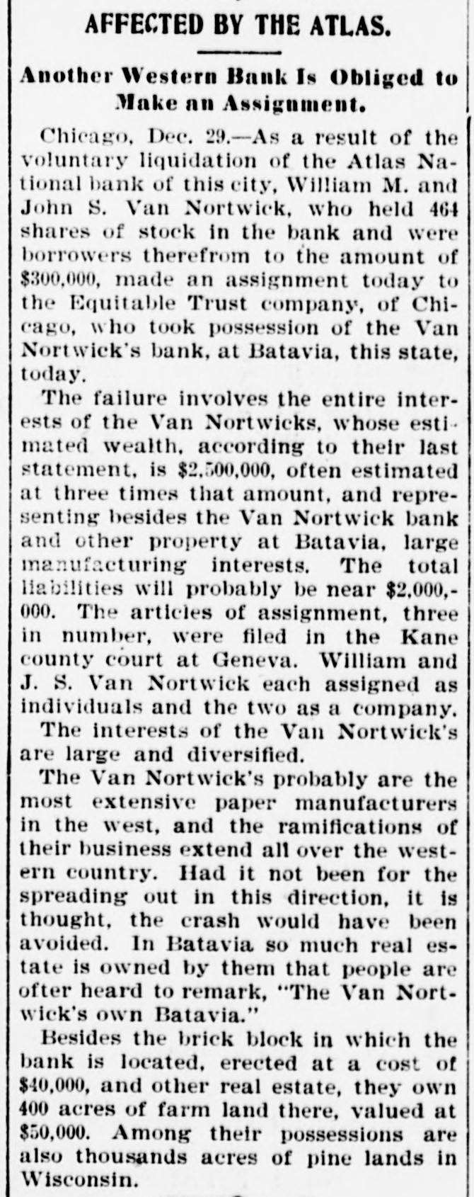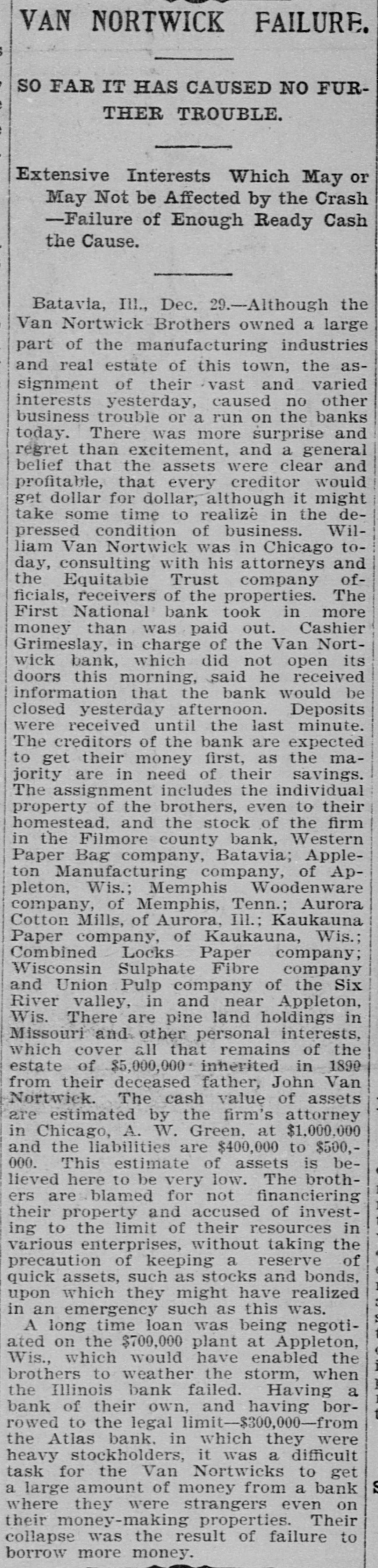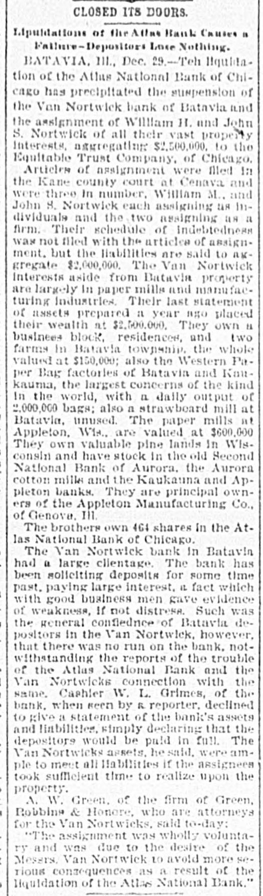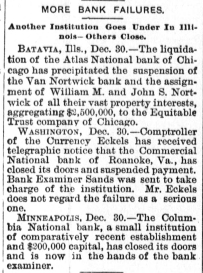 BANKS WITH BROKEN BACKS The Banks Beat Bryan and Gave Victory to Advance Agent of Prosperity. ENJOYING FRUITS OF THEIR *TRIUMPH Serious Bank Disasters in Illinois, Minnesota and Virginia To-day-Of Course Depositors Are Promised Full Payment. Batavia, Ill., Dec. 29.-The liquidation of the Atlas bank at Chicago has precipitated the suspension of the Van Northwick bank at Batavia. An assignment made by W. S. to the Northwick has been Equitable and liabilities Trust J.S. com- Van pany of Chicago. The are said to aggregate $2,000,000. The Van Northvicks interests are largely in paper mills and manufacturing industries valned at $2,500,000. AND STILL ANOTHER. Minneapolis, Minn. - The Columbia an institution of comrecent National paratively bank, establishment its doors having this capital closed and is in the to its examiner. morning $200,000 According hands of last the state- bank ment on December 17, it had loans and discounts amounting to $348,145; bonds to secure circulation $50,000; real estate and mortgages $48,728; due from other banks $42,897; cash reserve $34,872; other cash items $11,852; national bank notes outstanding $45,000; due to other banks $136,679; deposits subject to certificates check $101,507; cashier's of deposit checks $632,934; certified and $3,313; bills payable $15,000. Cashier Joseph Goebletter said: "We could have stood the pressure a little longer, but to protect the majority we closed this morning. We have $33,000 in cash and inside of sixty days we expect to have fully $100,000 more collected. Our total liabilities are only $247,000. There is no doubt that we will be able to pay depositors in full and effect a fair settlement with the stockholders." The officers are: Charles Kettleson, president; H. Thorson, vice-president; Joseph Goebletter. cashier. The bank is the immediate charge of Geo. . Coffin, deputy comptroller of the currency. "I believe," said Mr. Coffin, "that the suspension will not cause any further trouble. The national banks of this city are strong financially." ANOTHER FAILURE AT MINNEAPOLIS. The Washington bank, a state institution, closed its doors this noon. This bank had a capital of $100,000, and by the last statement, at the close of business on December 17, it had $407,104 1 loans and discounts; $14,228 in overdrafts secured; $20,165 in stocks and bonds; $14,475 in real estate, and $88,272 in cash on hand. The deposits are $363,133; certificates of deposit,$112,587;bank deposits, $84,937. A. C. Haugan, city treasurer, was one of the founders of the bank and is one of the directors. O. E. Breecke is cashier. BANK DISASTER IN ILLINOIS. Batavia, Ill.-William and John Van Nortwick's bank did not open this morning. There was no run on the other banks in Batavia and no failures are reThe Van Nortwicks held 464 the Atlas National of the bank here is closing shares ported. in bank due and to the the assignment of the brothers to the Equitable Trust company of Chicago. Cashier Grimes, who was in charge of the Van Nortwick bank, said to-day that he had no intimation that the bank would liquidate until 12 o'clock yesterday noon, when C. C. Wilson, representing the Equitable Trust company, walked into the bank and said that he had been sent down by the company to take charge. "The assignment made by Van Nortwicks," said Grimes, "includes everything they have and it is my belief that the creditors of the bank will e paid in full." IN THE IRON DISTRICT. Washington.-Comptroller of the Currency Eckels received notice to-day that the Commercial National Bank, of Roanoke, Va., had suspended payment. Bank Examiner Sands was sent to take charge. Eckels does not regard the failure as serious. The last report to him, November 17, showed the assets to be $263,504; deposits, $75,000; other libilities, $85,000 The failure is attributed by Eckels in part to speculation.