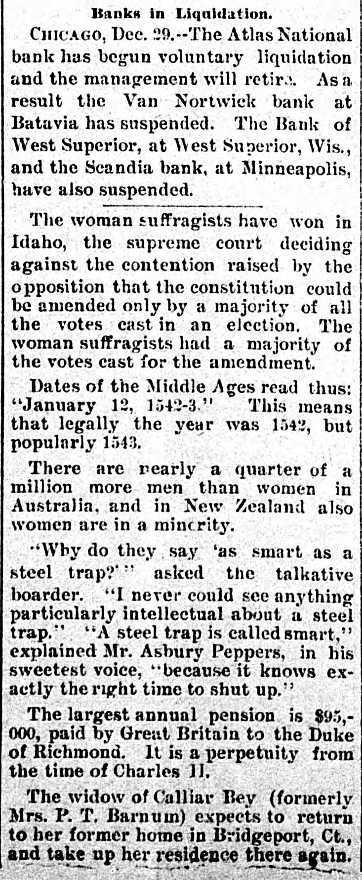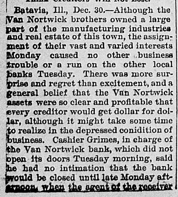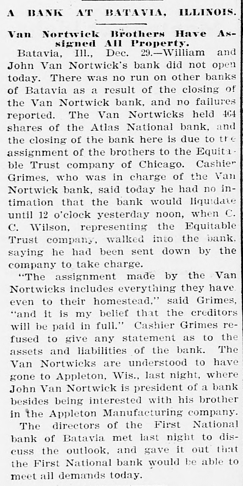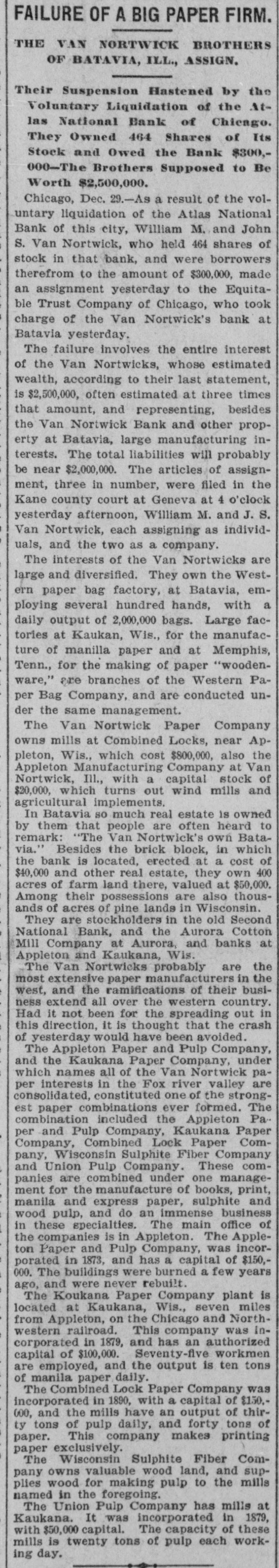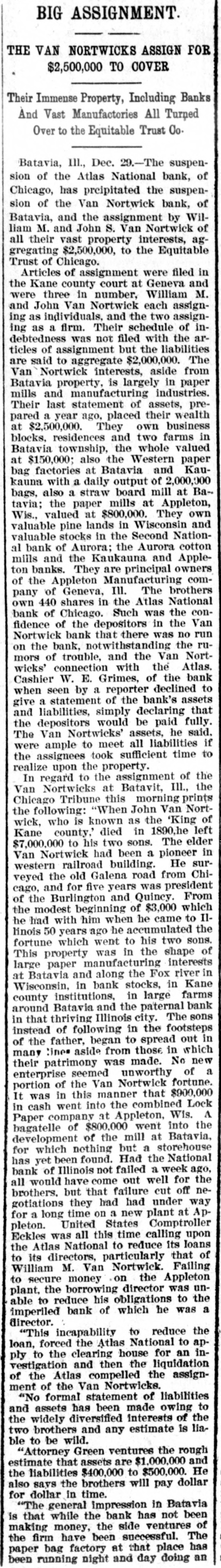 BANKS WITH BROKEN BACKS The Banks Beat Bryan and Gave Victory to Advance Agent of Prosperity. ENJOYING FRUITS OF THEIR *TRIUMPH Serious Bank Disasters in Illinois, Minnesota and Virginia To-day-Of Course Depositors Are Promised Full Payment. Batavia, Ill., Dec. 29.-The liquidation of the Atlas bank at Chicago has precipitated the suspension of the Van Northwick bank at Batavia. An assignment made by W. S. to the Northwick has been Equitable and liabilities Trust J.S. com- Van pany of Chicago. The are said to aggregate $2,000,000. The Van Northvicks interests are largely in paper mills and manufacturing industries valned at $2,500,000. AND STILL ANOTHER. Minneapolis, Minn. - The Columbia an institution of comrecent National paratively bank, establishment its doors having this capital closed and is in the to its examiner. morning $200,000 According hands of last the state- bank ment on December 17, it had loans and discounts amounting to $348,145; bonds to secure circulation $50,000; real estate and mortgages $48,728; due from other banks $42,897; cash reserve $34,872; other cash items $11,852; national bank notes outstanding $45,000; due to other banks $136,679; deposits subject to certificates check $101,507; cashier's of deposit checks $632,934; certified and $3,313; bills payable $15,000. Cashier Joseph Goebletter said: "We could have stood the pressure a little longer, but to protect the majority we closed this morning. We have $33,000 in cash and inside of sixty days we expect to have fully $100,000 more collected. Our total liabilities are only $247,000. There is no doubt that we will be able to pay depositors in full and effect a fair settlement with the stockholders." The officers are: Charles Kettleson, president; H. Thorson, vice-president; Joseph Goebletter. cashier. The bank is the immediate charge of Geo. . Coffin, deputy comptroller of the currency. "I believe," said Mr. Coffin, "that the suspension will not cause any further trouble. The national banks of this city are strong financially." ANOTHER FAILURE AT MINNEAPOLIS. The Washington bank, a state institution, closed its doors this noon. This bank had a capital of $100,000, and by the last statement, at the close of business on December 17, it had $407,104 1 loans and discounts; $14,228 in overdrafts secured; $20,165 in stocks and bonds; $14,475 in real estate, and $88,272 in cash on hand. The deposits are $363,133; certificates of deposit,$112,587;bank deposits, $84,937. A. C. Haugan, city treasurer, was one of the founders of the bank and is one of the directors. O. E. Breecke is cashier. BANK DISASTER IN ILLINOIS. Batavia, Ill.-William and John Van Nortwick's bank did not open this morning. There was no run on the other banks in Batavia and no failures are reThe Van Nortwicks held 464 the Atlas National of the bank here is closing shares ported. in bank due and to the the assignment of the brothers to the Equitable Trust company of Chicago. Cashier Grimes, who was in charge of the Van Nortwick bank, said to-day that he had no intimation that the bank would liquidate until 12 o'clock yesterday noon, when C. C. Wilson, representing the Equitable Trust company, walked into the bank and said that he had been sent down by the company to take charge. "The assignment made by Van Nortwicks," said Grimes, "includes everything they have and it is my belief that the creditors of the bank will e paid in full." IN THE IRON DISTRICT. Washington.-Comptroller of the Currency Eckels received notice to-day that the Commercial National Bank, of Roanoke, Va., had suspended payment. Bank Examiner Sands was sent to take charge. Eckels does not regard the failure as serious. The last report to him, November 17, showed the assets to be $263,504; deposits, $75,000; other libilities, $85,000 The failure is attributed by Eckels in part to speculation.