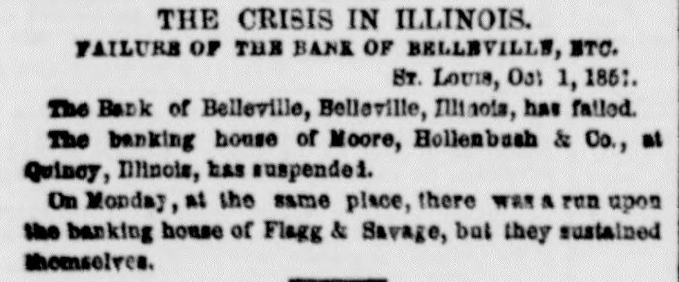 THE CRISIS IN ILLINOIS. FAILURE OF THE BANK OF BELLEVILLE, ETC. Sr. Louis, Oat 1, 1851. The Bank of Belleville, Belleville, Illinois, has failed. The banking house of Moore, Hollenbash & Co., at Quincy, Illinois, has suspendei. On Monday, at the same place, there was a run upon the banking house of Flagg & Savage, but they sustained thomselves.