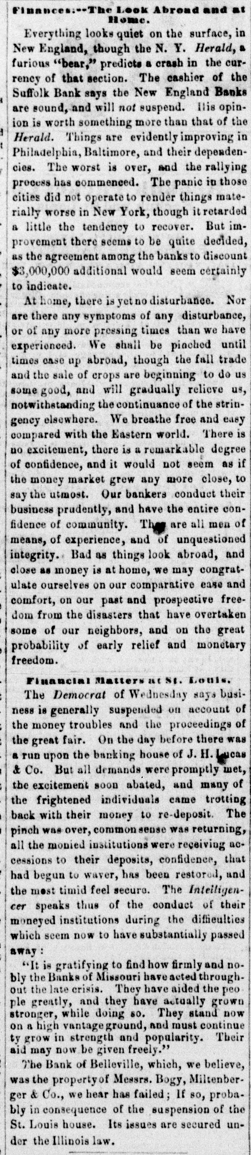 Finances:--The Look Abroad and at Home. Everything looks quiet on the surface, in New England, though the N. Y. Herald, a furious "bear," predicts a crash in the currency of that section. The cashier of the Suffolk Bank says the New England Banks are sound, and will not suspend. Ilis opinion is worth something more than that of the Herald. Things are evidently improving in Philadelphia, Baltimore, and their dependencies. The worst is over, and the rallying process has commenced. The panic in those cities did not operate to render things materially worse in New York, though it retarded a little the tendency to recover. But improvement there seems to be quite decided, as the agreement among the banks to discount $3,000,000 additional would seem certainly to indicate. At home, there is yet no disturbance. Nor are there any symptoms of any disturbance, or of any more pressing times than we have experionced. We shall be pinched until times case up abroad, though the fall trade and the sale of crops are beginning to do us some good, and will gradually relieve us, notwithstanding the continuance of the stringency elsewhere. We breathe free and easy compared with the Eastern world. There is no excitement, there is a remarkable degree of confidence, and it would not seem as if the money market grew any more close, to say the utmost. Our bankers conduct their business prudently, and have the entire confidence of community. The are all men of means, of experience, and of unquestioned integrity. Bad as things look abroad, and close as money is at home, we may congratulate ourselves on our comparative ease and comfort, on our past and prospective freedom from the disasters that have overtaken some of our neighbors, and on the great probability of early relief and monetary freedom. Financial Matters at St. Louis. The Democrat of Wednesday says business is generally suspended on account of the money troubles and the proceedings of the great fair. On the day before there was a run upon the banking house of J. H. Lucas & Co. But all demands were promptly met, the excitement soon abated, and many of the frightened individuals came trotting back with their money to re-deposit. The pinch was over, common sense was returning, all the monied institutions were receiving accessions to their deposits, confidence, that had begun to waver, has been restored, and the most timid feel secure. The Inteiligencer speaks thus of the conduct of their moneyed institutions during the difficulties which seem now to have substantially passed away: "It is gratifying to find how firmly and nobly the Banks of Missouri have acted throughout the late crisis. They have aided the people greatly, and they have actually grown stronger, while doing so. They stand now on a high vantage ground, and must continue ty grow in strength and popularity. Their aid may now be given freely." The Bank of Belleville, which, we believe, was the property of Messrs. Bogy, Miltenberger & Co., we hear has failed; If so, probably in consequence of the suspension of the St. Louis house. Its issues are secured under the Illinois law.