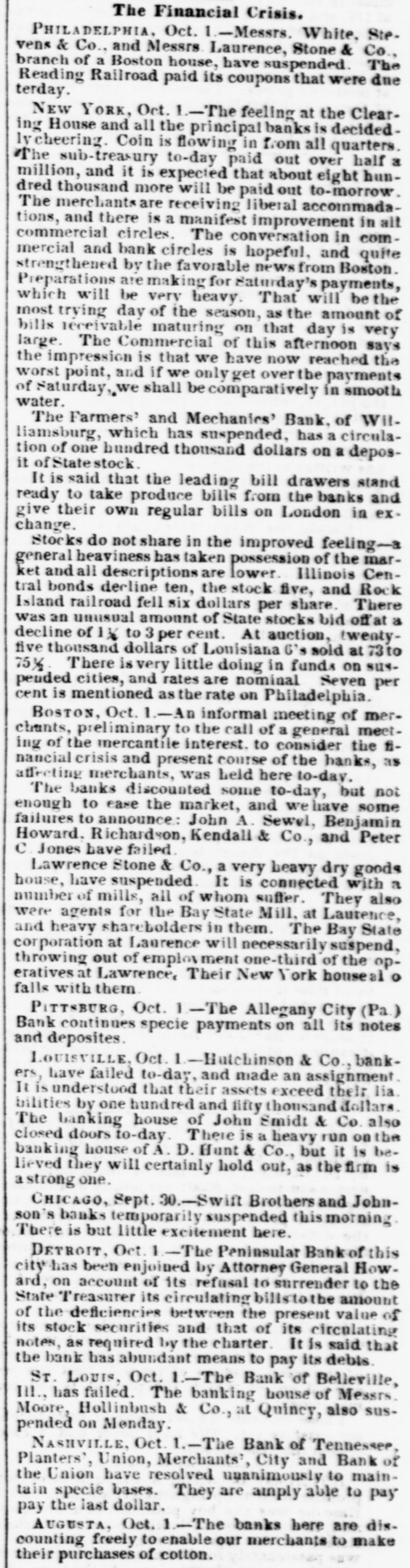 LATEST NEWS. More Banks Breaking-Financial News from the East, &c., &c. LOUISVILLE, Oct. 1. A despatch to the Bulletin says, Exchange, Shelbyville, Lawrencebury, and Trenton Banks, Tennessee, have suspended. The run on Hunt & Co.. of this city ceased before they closed business, they are considered strong. Sr. LOUIS, Oct. 1. The Bank of Belleville, III., failed. Banking House of More, Halebush & Co., Quincy. III., suspended on Monday. Run on Flagg & Sauage, of same place, but they sustained themselves. LOUISVILLE, Oct. 1. Hutchins & Co., John Schmidt & Co., Bankers, suspended. Quite a heavy run on A. D. Hunt & Co., who thus farsustain them selves, and it is expected will meet their liabilities. Philadelphia, Oct. 1. White, Stevens & Co., and Lawrence, Stone & Co., who have a Branch House in Boston, suspended to-day. PITTSBURGH, Oct. 1. The Old Bank of Pittsburgh continues to pay specie on all its liabilities. COLUMBUS, Sept. 30. The Board of Control of the State Bank of Ohio, at a meeting held here to-day, unanimously adopted the following resolution : Resolved, That the branches of the State Bank of Ohio have the ability and will still continue specie payments, regardless of whatever course may be taken by the Banks of other States. DETROIT, October 1. The suspension of the Peninsular Bank causes intense extitement. The run on other Banks this morning is severe, principally by small bill holders. They redeem promptly and are to all appearances strong. State Fair commenced on Tuesday. NEW YORK, Oct. 1. The Farmers & Athens Bank of Long Island, and Williamsburgh, suspended to-day.The Illinois C. R. R. pays its cupons to-day. The Mil. & Miss. R. R. pay theirs on the 1st mortgage bonds, but defaults on its income. CHARLESTON, Oct. 1. Reported forgeries on Jno. Frazies & Co., are unfounded. The Presidents of our Banks held a meeting this morning, and resolved not to suspend. WASHINGTON, Oct. 1. Two million dollars worth of U.S. stocks came in this morning for redemption. PHILADEPHIA, Sept. 30-3 P. M. The banksare still pursuing an inharmonious course, thereby causing trouble and vexation to the business men. The Pennsylvania Bank refuses for the present to come into any arrangements with the banks, bearing that her largest depositors will remove their balances to other banks, creating large indebtedness to them which could not at once be settled withont difficulty. Arrangements are making to place her on a firm basis. The other banks are at variance, refusing to receive the certified checks of each other.— There is confusion in all the arrangements of parties having notes due while the funds are locked up. The people feel outraged at the want of system, and the necessity for a clearing house is becoming daily more important. BOSTON. Sept. 30-3 P. M. At the adjourned meeting of Bank Presidents to-day, it was decided to discount during the week, nearly three millions. This will ease the market and largely restore confidence. PITTSBURGH, Sept. 30-3 P. M. The Alleghany City Bank continues to pay specie on all its notes and deposits. HARTFORD, Sept. 29-3 P. M. The Hartford Banks have no idea of suspenking specie payment. They are stronger than they were last week.