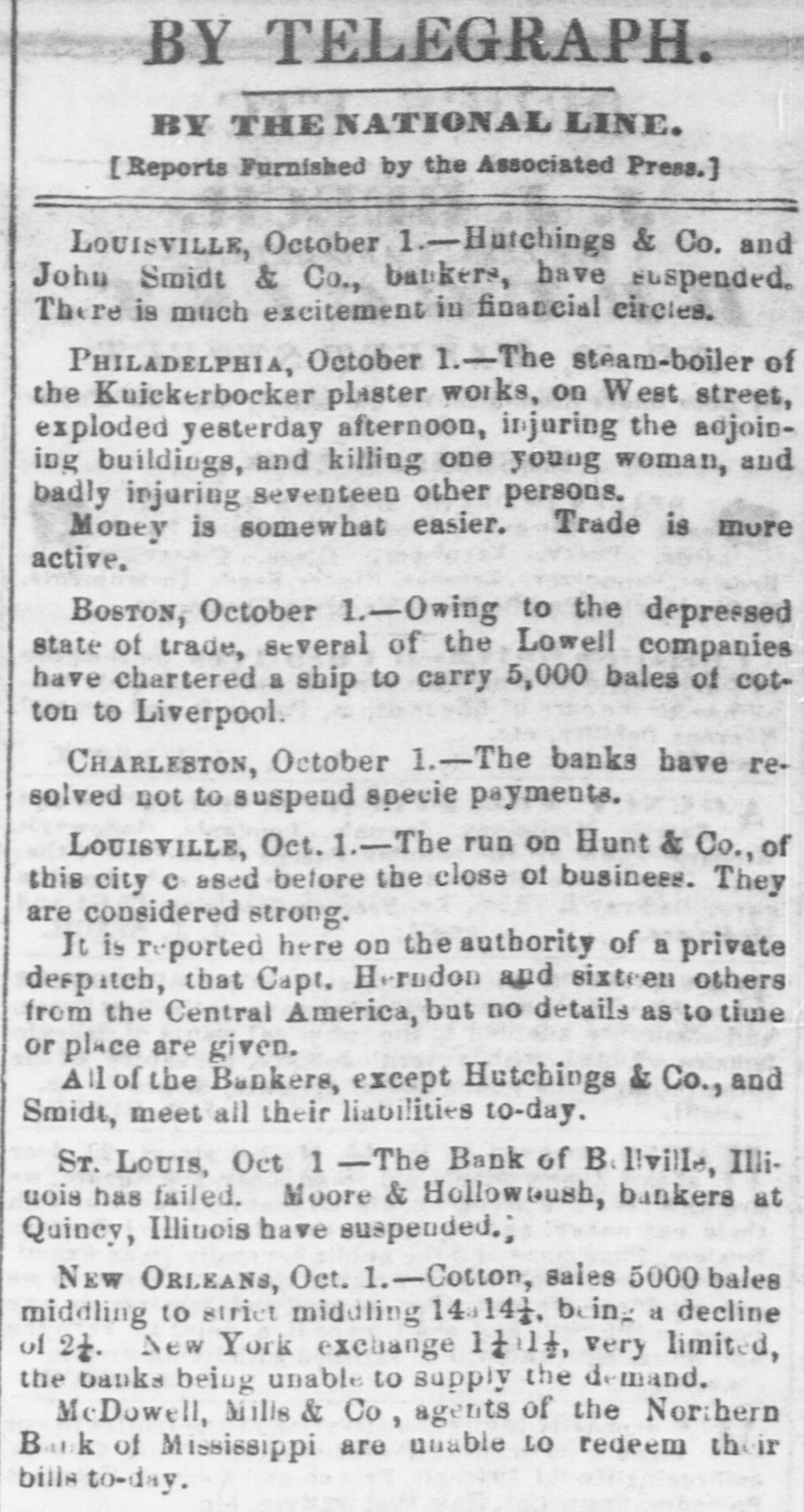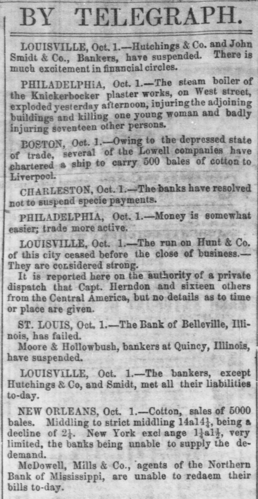 BY TELEGRAPH. LOUISVILLE, Oct. 1.-Hutchings & Co. and John Smidt & Co., Bankers, have suspended. There is much excitement in financial circles. PHILADELPHIA, Oct. 1.-The steam boiler of the Knickerbocker plaster works, on West street, exploded yesterday afternoon, injuringthe adjoining buildings and killing one young woman and badly injuring seventeen other persons. BOSTON, Oct. 1.-Owing to the depressed state of trade, several of the Lowell companies have chartered a ship to carry 500 bales of cotton to Liverpool. CHARLESTON, Oct. 1.-The banks have resolved not to suspend specie payments. PHILADELPHIA, Oct. 1.-Money is somewhat easier; trade more active. LOUISVILLE, Oct. 1.-The run on Hunt & Co. of this city ceased before the close of business.They are considered strong. It is reported here on the authority of a private dispatch that Capt. Herndon and sixteen others from the Central America, but no details as to time or place are given. ST. LOUIS, Oct. 1.-The Bank of Belleville, Illinois, has failed. Moore & Hollowbush, bankers at Quincy, Illinois, have suspended. LOUISVILLE, Oct. 1.-The bankers, except Hutchings & Co, and Smidt, met all their liabilities to-day. NEW ORLEANS, Oct. 1.-Cotton, sales of 5000 bales. Middling to strict middling 14a14}, being a decline of 21. New York excl ange 14a1}, very limited, the banks being unable to supply the dedemand. McDowell, Mills & Co., agents of the Northern Bank of Mississippi, are unable to redaem their bills to-day.