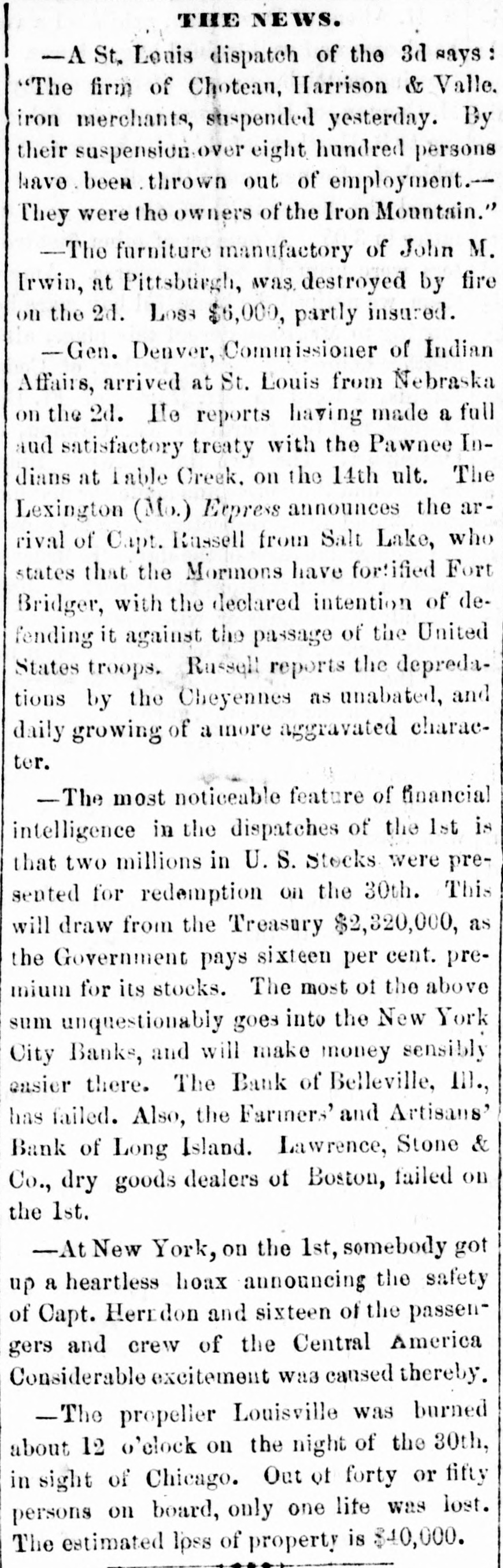 THE NEWS. -A St, Lenis dispatch of the 3d says: The firm of Chotean, Harrison & Valle, iron merchants, suspended yesterday. By their suspension over eight hundred persons have been thrown out of employment.-They were the owners of the Iron Mountain." -The furniture manufactory of John M. Irwin, at Pittsburgh, was destroyed by fire on the 2d. Loss $6,000, partly insured. -Gen. Denver, Commissioner of Indian Affairs, arrived at St. Louis from Nebraska on the 2d. He reports having made a full and satisfactory treaty with the Pawnee Indians at Table Creek. on the 14th ult. The Lexington (Mo.) Express announces the arrival of Capt. Bussell from Salt Lake, who states that the Mormons have fortified Fort Bridger, with the declared intention of defending it against the passage of the United States troops. Russell reports the depredations by the Cheyennes as unabated, and daily growing of a more aggravated character. -The most noticeable feature of financial intelligence in the dispatches of the 1st is that two millions in U. S. Stocks were presented for redemption on the 30th. This will draw from the Treasury $2,320,000, as the Government pays sixteen per cent. premium for its stocks. The most of the above sum unquestionably goes into the New York City Banks, and will make money sensibly easier there. The Bank of Belleville, 111., has failed. Also, the Farmers' and Artisans' Bank of Long Island. Lawrence, Stone & Co., dry goods dealers of Boston, failed on the 1st. -At New York, on the 1st, somebody got up a heartless hoax announcing the safety of Capt. Herrdon and sixteen of the passengers and crew of the Central America Considerable excitement waa caused thereby. -The propeller Louisville was burned about 12 o'clock on the night of the 30th, in sight of Chicago. Out of forty or fifty persons on board, only one life was lost. The estimated loss of property is $40,000.