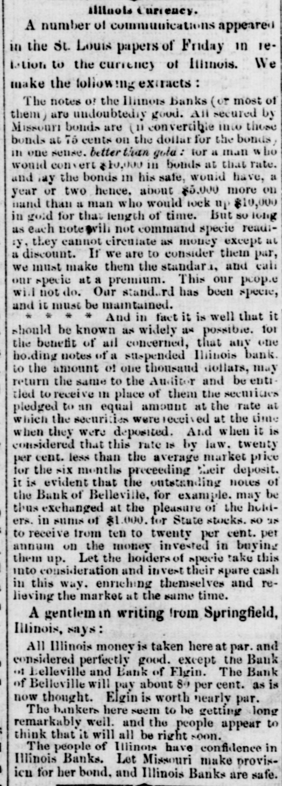 illinois Currency. A number of communications appeared in the St. Louis papers of Friday in reIstion to the currency of Ithnois. We make the follow extracts : The notes o! the Illinois Banks (or most of them) are undoubtedly good. All secured by Missouri bonds are (II convertible into those bonds at 75 cents on the dollar for the bonds, in one sense. better than gota: for a man be would convert $10,000 in bonds at that rate. and ,ay the bonds in his safe, would have, a year or two hence, about $5,000 more on hand than a man who would rock up $10,000 in gold for that length of time. But SO long as each note will not command specie readiiy, they cannot circulate as money except at a discount. If we are to consider them par, we must make them the standara, and cali our specie at a premium. This our people will not do. Our stand. has been specie, and it must be maintained. * * And in fact it is well that it should be known as widely as possible. for the benefit of ail concerned, that any one holding notes of a suspended Illinois bank. to the amount of one thousand dollars, may return the same to the Auditor and be entrtled to receive III place of them the securities pledged to an equal amount at the rate at which the securities were received at the time when they were deposited. And when it is considered that this rate IS by law. twenty per cent. less than the average market price for the six months preceeding their deposit. it is evident that the outstanding notes of the Bank of Belleville, for example. may be thus exchanged at the pleasure of the holders. in sums of $1.000. for State stocks. SO us to receive from ten to twenty per cent. per annum on the money invested in buying them up. Let the holders of specie take this into consideration and invest their spare cash in this way, enriching themselves and relieving the market at the same time. A gentlem in writing from Springfield, Illinois, says: All Illinois money is taken here at par. and considered perfectly good. except the Bank of Belleville and Bank of Elgin. The Bank of Belleville will pay about 80 per cent. as is now thought. Elgin is worth nearly par. The bankers here seem to be getting long remarkably well. and the people appear to think that it will all be right soon. The people of Illinois have confidence in Illinois Banks. Let Missouri make provisicn for her bond, and Illinois Banks are safe.