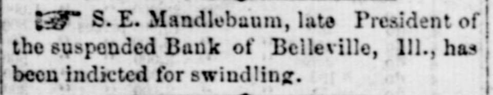 INDICTED FOR SWINDLING.-II's have gained information from a reliable quarter, that the Grand Jury of St. Clair county, IH., in session at Belleville, last week, found a true bill indicting S. E. Mandlebaum, President of the suspended Bank of Belleville. The sudden and unex. pected suspension of that institution, about the first of October, apparently in the full side of success at the time, created DO Jiezle indignation among the stockholders and depositors throughout the country, and it was with great difficulty that violent measures on the part of the more revengeful were prevented. At one time the feeling was so strong that Mr. Man. dlebaum was seriously threatened with personal chastisement. The finding of an indictment by the Grand Jury would seem to indicate that the hostility against him has not wholly abased [Alton Courier, 24th. and