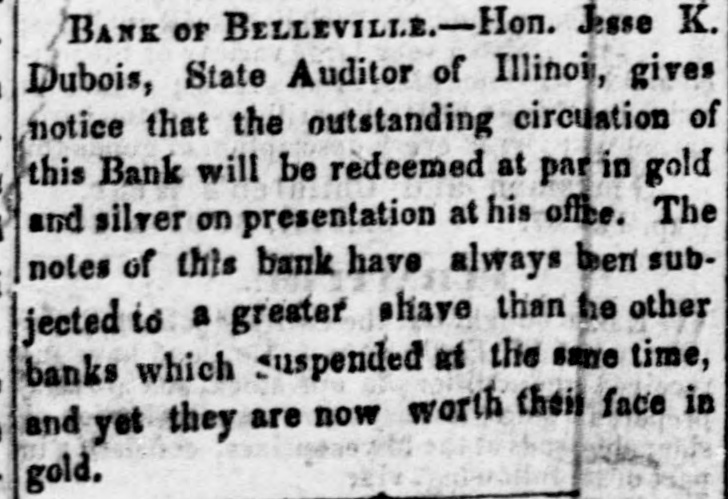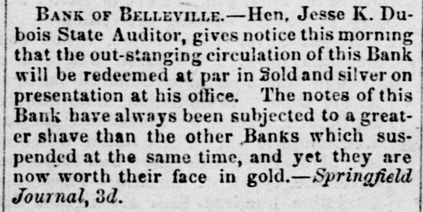 BANK OF BELLEVILLE.-Hen, Jesse K. Dubois State Auditor, gives notice this morning that the out-stanging circulation of this Bank will be redeemed at par in Sold and silver on presentation at his office. The notes of this Bank have always been subjected to a greater shave than the other Banks which suspended at the same time, and yet they are now worth their face in gold.-Springfield Journal, 3d.