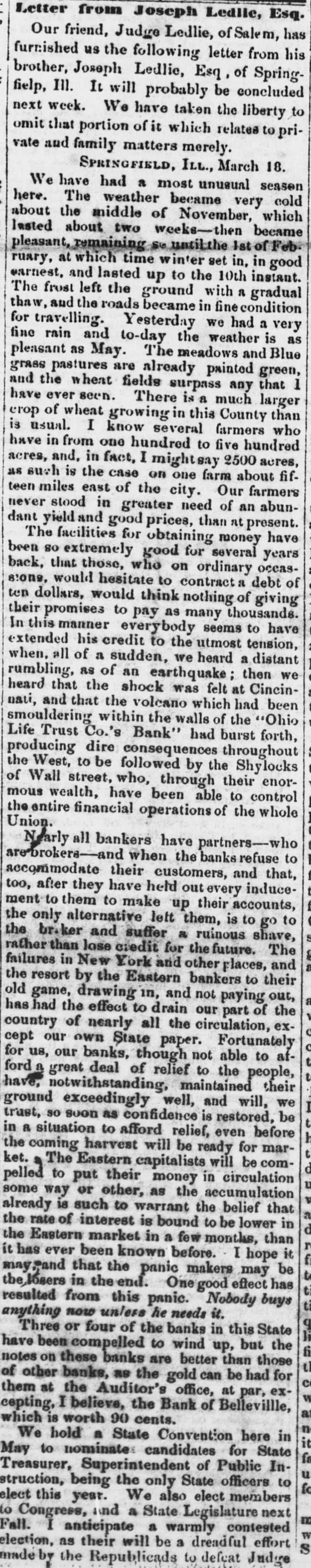 Letter from Joseph Ledlic, Esq. Our friend, Judge Ledlie, of Salem, has furnished us the following letter from his brother, Joseph Ledlie, Esq, of Springfielp, III. It will probably be concluded next week. We have taken the liberty to omit that portion of it which relates to private and family matters merely. SPRINGFIELD, ILL., March 18. We have had a most unusual season here. The weather became very cold about the middle of November, which lasted about two weeks-then became pleasant, remaining Sie untilthe 1st of Feb ruary, at which time winter set in, in good earnest, and lasted up to the 10th instant. The frost left the ground with a gradual thaw, and the roads became in fine condition for travelling. Yesterday we had a very fine rain and to-day the weather is as pleasant as May. The meadows and Blue grass pastures are already painted green, and the whent fields surpass any that 1 have ever seen. There is a much larger crop of wheat growing in this County than is usual. I know several farmers who have in from one hundred to five hundred acres, and, in fact, I mightsay 2500 acres, as such is the case on one farm about fifteen miles east of the city. Our farmers never stood in greater need of an abundant yield and good prices, than at present. The facilities for obtaining money have been so extremely good for several years back, that those, who on ordinary occassons, would hesitate to contract a debt of ten dollars, would think nothing of giving their promises to pay as many thousands. In this manner everybody seems to have extended his credit to the utmost tension, when, all of a sudden, we heard a distant rumbling, as of an earthquake then we heard that the shock was felt at Cincinnati, and that the volcano which had been smouldering within the walls of the "Ohio Life Trust Co.'s Bank' had burst forth, producing dire consequences throughout the West, to be followed by the Shylocks of Wall street, who, through their enormous wealth, have been able to control the entire financial operations of the whole Union. Nearly all bankers have partners-who brokers-and when the banks refuse to accommodate their customers, and that, too, after they have held out every inducement to them to make up their accounts, the only alternative left them, is to go to the br.ker and suffer a ruinous shave, rather than lose credit for the future. The failures in New York and other places, and the resort by the Eastern bankers to their old game, drawing in, and not paying out, has had the effect to drain our part of the country of nearly all the circulation, except our own State paper. Fortunately for us, our banks, though not able to ford a great deal of relief to the people, have, notwithstanding, maintained their ground exceedingly well, and will, we trust, so soon as confidence is restored, be in a situation to afford relief, even before the coming harvest will be ready for market. a The Eastern capitalists will be compelled to put their money in circulation some way or other, as the accumulation already is such to warrant the belief that the rate of interest is bound to be lower in the Eastern market in a few months, than it has ever been known before. I hope it any and that the panic makers may be 16sers in the end. One good effect has resulted from this panic. Nobody buys anything now unless he needs it. Three or four of the banks in this State have been compelled to wind up, but the notes on these banks are better than those of other banks, as the gold can be had for them at the Auditor's office, at par, excepting, I believe, the Bank of Bellevillle, which is worth 90 cents. We hold a State Convention here in May to nominate candidates for State Treasurer, Superintendent of Public Instruction, being the only State officers to elect this year. We also elect members to Congress, and a State Legislature next Fall. I anticipate a warmly contested election, as their will be a dreadful effort made by the Republicads to defeat Judge