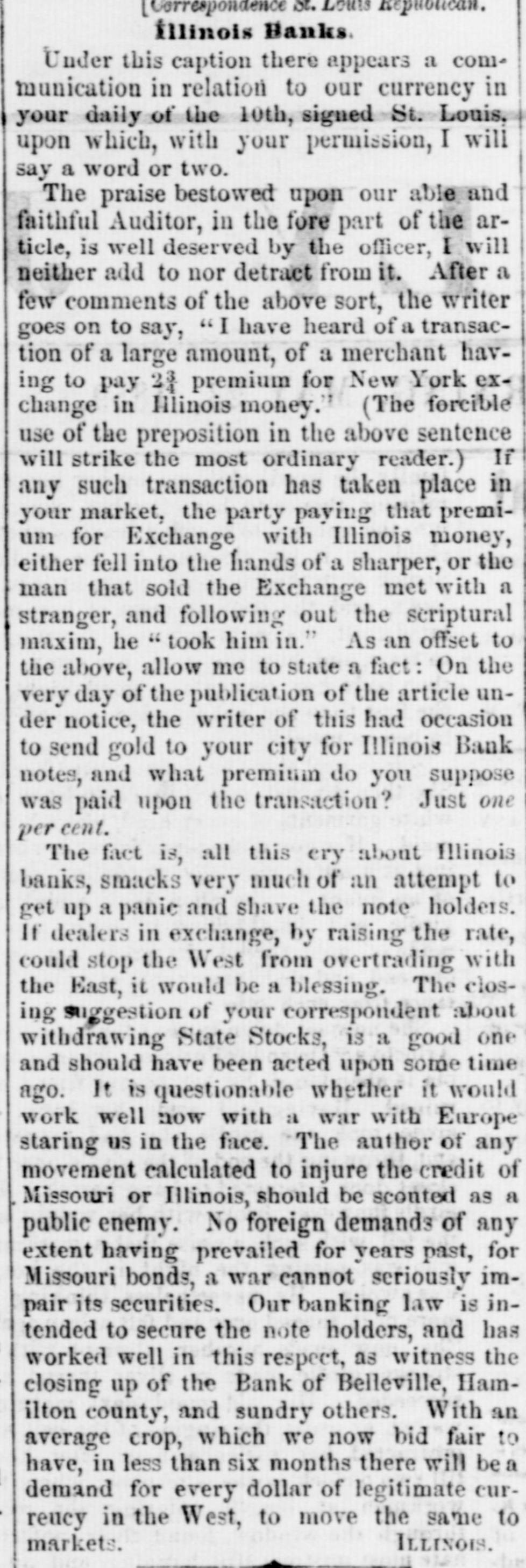 [Correspondence St. Louis Republican. # Illinois Banks. Under this caption there appears a communication in relation to our currency in your daily of the 10th, signed St. Louis, upon which, with your permission, I will say a word or two. The praise bestowed upon our able and faithful Auditor, in the fore part of the article, is well deserved by the officer, I will neither add to nor detract from it. After a few comments of the above sort, the writer goes on to say, "I have heard of a transaction of a large amount, of a merchant having to pay 2¾ premium for New York exchange in Illinois money." (The forcible use of the preposition in the above sentence will strike the most ordinary reader.) If any such transaction has taken place in your market, the party paying that premium for Exchange with Illinois money, either fell into the hands of a sharper, or the man that sold the Exchange met with a stranger, and following out the scriptural maxim, he "took him in." As an offset to the above, allow me to state a fact: On the very day of the publication of the article under notice, the writer of this had occasion to send gold to your city for Illinois Bank notes, and what premium do you suppose was paid upon the transaction? Just one per cent. The fact is, all this cry about Illinois banks, smacks very much of an attempt to get up a panic and shave the note holders. If dealers in exchange, by raising the rate, could stop the West from overtrading with the East, it would be a blessing. The closing suggestion of your correspondent about withdrawing State Stocks, is a good one and should have been acted upon some time ago. It is questionable whether it would work well now with a war with Europe staring us in the face. The author of any movement calculated to injure the credit of Missouri or Illinois, should be scouted as a public enemy. No foreign demands of any extent having prevailed for years past, for Missouri bonds, a war cannot seriously impair its securities. Our banking law is intended to secure the note holders, and has worked well in this respect, as witness the closing up of the Bank of Belleville, Hamilton county, and sundry others. With an average crop, which we now bid fair to have, in less than six months there will be a demand for every dollar of legitimate currency in the West, to move the same to markets. ILLINOIS.