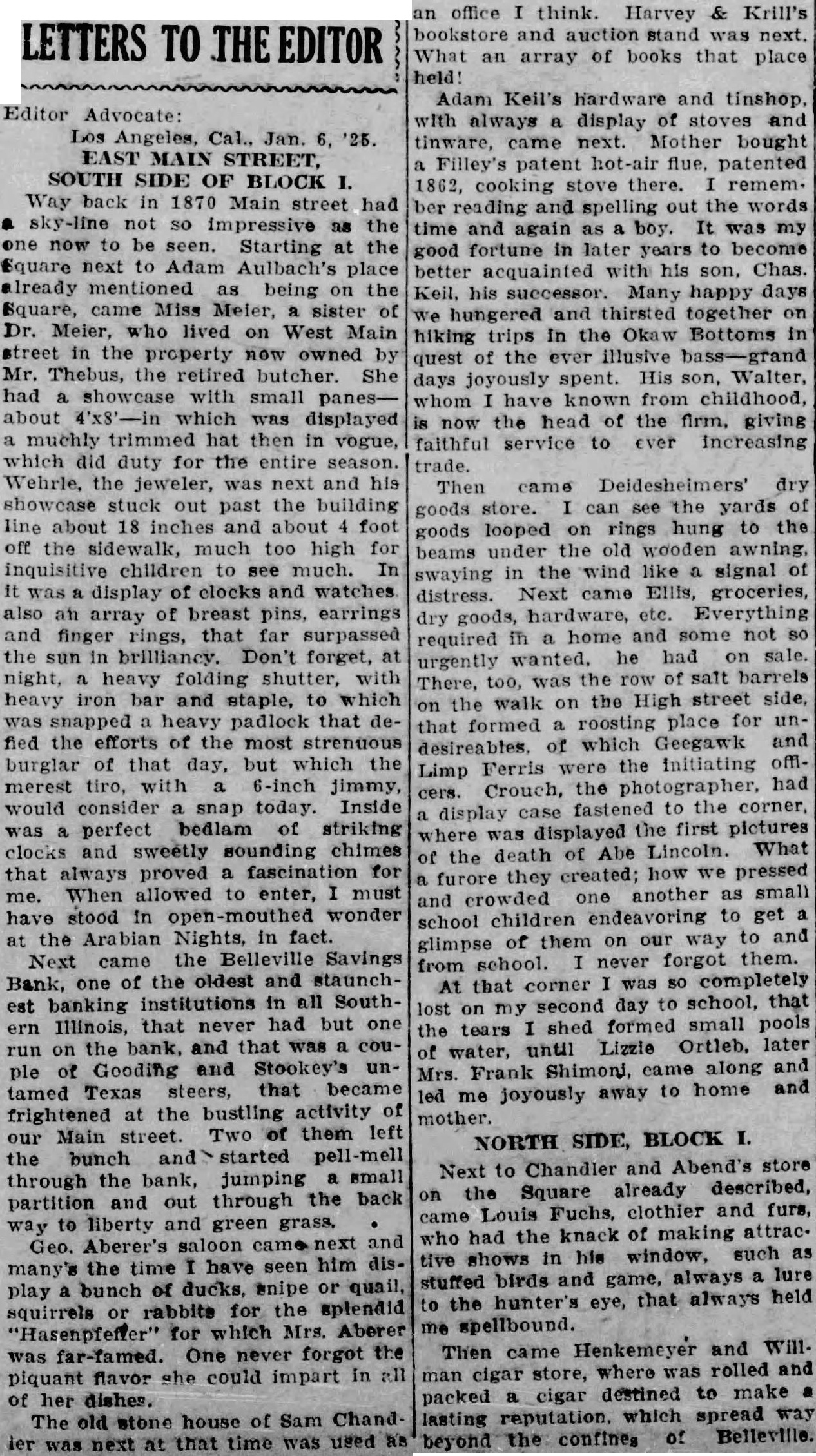 LETTERS TO THE EDITOR Editor Advocate: Los Angeles, Cal., Jan. 6, '25. EAST MAIN STREET, SOUTH SIDE OF BLOCK I. Way back in 1870 Main street had sky-line not so impressive as the now be seen. Starting at the Square next to Adam Aulbach's place already mentioned being on the Square, came Miss Meier, sister of Dr. Meier, who lived on West Main street in the property now owned by Mr. Thebus, the retired butcher. She had showcase with small panesabout 4'x8'-in which was displayed muchly trimmed hat then in vogue, which did duty for the entire season. Wehrle, the jeweler, was next and his showcase stuck out past the building line about 18 inches and about foot off the sidewalk, much too high for inquisitive children to see much. In It was display of clocks and watches also an array of breast pins, earrings and finger rings, that far surpassed the sun brilliancy. Don't forget, at night, heavy folding shutter, with heavy iron bar and staple, to which snapped heavy padlock that defied the efforts of the most strenuous burglar of that day, but which the merest tiro, with 6-inch jimmy, would consider snap today. Inside was perfect bedlam of striking clocks and sweetly sounding chimes that always proved fascination for me. When allowed to enter, must have stood in open-mouthed wonder at the Arabian Nights, in fact. Next came the Belleville Savings Bank, one of the oldest and staunchest banking institutions in all Southern Illinois, that never had but one run on the bank, and that was couple of Gooding and Stookey's untamed Texas steers, that became frightened at the bustling activity of our Main street. Two of them left the bunch and started pell-mell through the bank, jumping small partition and out through the back way to liberty and green grass. Geo. Aberer's saloon came and many's the time have seen him play a bunch of ducks, enipe or quail, squirrels or rabbits for the spiendid "Hasenpfener" for which Mrs. Aberer was far-famed. One never forgot the piquant flavor she could impart in all of her dishes. The old stone house of Sam Chand ier was next at that time was used as an office I think. Harvey & Krill's bookstore and auction stand next. What an array of books that place held! Adam Keil's hardware and tinshop, with always a display of and tinware, came next. Mother bought Filley's patent hot-air flue, patented 1862, cooking stove there. remem. ber reading and spelling out the words time and again as a boy. It was my good fortune in later years to become better acquainted with his son, Chas. Keil, successor. Many happy days We hungered and thirsted together on hiking trips In the Okaw Bottoms in quest the ever illusive bass-grand days joyously spent. His son, Walter, whom have known from childhood, now the head of the firm, giving faithful service to ever increasing trade. Then came Deidesheimers' dry goods store. can see the yards of goods looped on rings hung to the beams under the old wooden awning. swaying in the wind like signal of distress. Next came Ellis, grocerles, dry goods, hardware, etc. Everything required in home some not so urgently wanted, he had on sale. There, too, was the row of salt barrels on the walk on the High street side, that formed a roosting place for undesireables. of which Geegawk and Limp Ferris were the initiating officers. Crouch, the photographer, had display case fastened to the corner, where displayed the first pictures of the death of Abe Lincoln. What furore they created; how we pressed and crowded one another as small school children endeavoring to get glimpse of them on our to and from school. never forgot them. At that corner was so completely lost on my second day to school, that the tears shed formed small pools of water, until Lizzie Ortleb, later Mrs. Frank Shimoni, came along and led me joyously away to home and mother. NORTH SIDE, BLOCK I. Next to Chandler and Abend's store on the Square already described, came Louis Fuchs, clothier and furs, who had the knack of making attractive shows in his window, such as stuffed birds and game, always lure to the hunter's eye, that always held me spellbound. Then came Henkemeyer and Willman cigar store, where rolled and packed cigar destined to make lasting reputation. which spread way confines of Belleville. beyond the