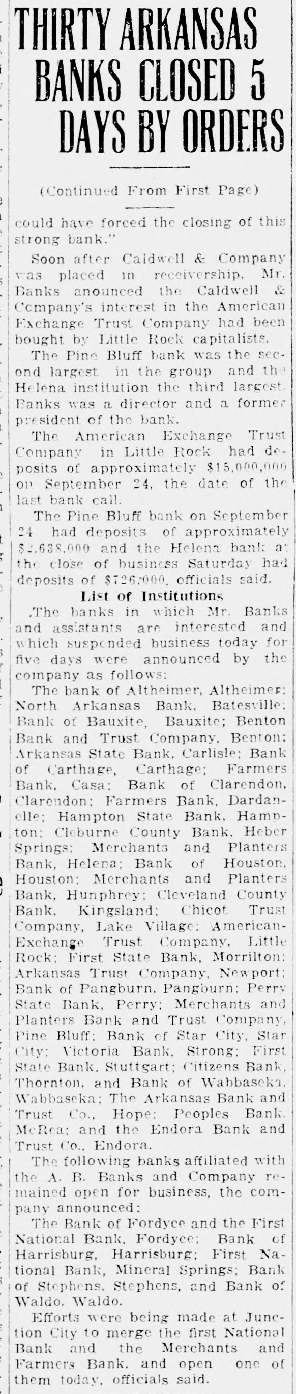 THIRTY ARKANSAS BANKS CLOSED 5 DAYS BY ORDERS (Continued From First Page) could have forced the closing of this strong bank." Soon after Caldwell & Company was placed in receivership, Mr. Banks anounced the Caldwell & Company's interest in the American Exchange Trust Company had been bought by Little Rock capitalists. The Pine Bluff bank was the second largest in the group and the Helena institution the third largest Banks was a director and a former president of the bank. The American Exchange Trust Company in Little Rock had deposits of approximately $15,000,000 OD September 24, the date of the last bank call. The Pine Bluff bank on September 24 had deposits of approximately $2,638,000 and the Helena bank at the close of business Saturday had deposits of $726,000. officials said. List of Institutions The banks in which Mr. Banks and assistants are interested and which suspended business today for five days were announced by the company as follows: The bank of Altheimer, Altheimer: North Arkansas Bank. Batesville; Bank of Bauxite, Bauxite; Benton Bank and Trust Company, Benton: Arkansas State Bank, Carlisle; Bank of Carthage, Carthage; Farmers Bank, Casa: Bank of Clarendon, Clarendon: Farmers Bank, Dardanelle: Hampton State Bank, Hamnton: Cleburne County Bank. Heber Springs: Merchants and Planters Bank, Helena; Bank of Houston, Houston: Merchants and Planters Bank, Hunphrey: Cleveland County Bank. Kingsland; Chicot Trust Company, Lake Village: AmericanExchange Trust Company, Little Rock: First State Bank, Morrilton: Arkansas Trust Company, Newport: Bank of Pangburn. Pangburn: Perry State Bank, Perry: Merchants and Planters Bank and Trust Company, Pine Bluff: Bank of Star City, Star City: Victoria Bank, Strong: First State Bank. Stuttgart: Citizens Bank Thornton. and Bank of Wabbaseka Wabbaseka; The Arkansas Bank and Trust Co., Hope: Peoples Bank McRea: and the Endora Bank and Trust Co., Endora. The following banks affiliated with the A. B. Banks and Company remained open for business, the company announced: The Bank of Fordyce and the First National Bank, Fordyce; Bank of Harrisburg, Harrisburg: First National Bank, Mineral Springs: Bank of Stephens, Stephens, and Bank of Waldo, Waldo. Efforts were being made at Junction City to merge the first National Bank and the Merchants and Farmers Bank. and open one of them today, officials said.