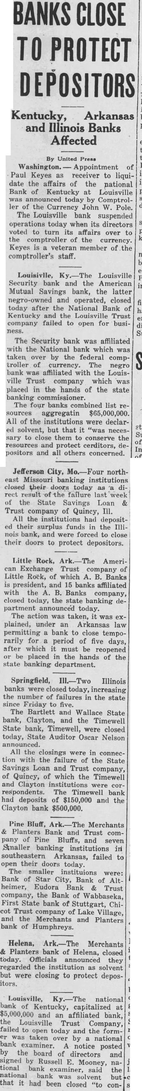 PROTECT DEPOSITORS Kentucky, Arkansas Affected United Paul Keyes receiver to date the affairs of the national Bank of Kentucky at Louisville today by Comptrolof the Currency John W. Pole. The Louisville bank suspended operations today when its directors voted turn its affairs comptroller of the Keyes veteran member of the comptroller's staff. Louisivlle, Louisville Security bank and the American Mutual Savings bank, the latter negro-owned operated, closed today after the National Bank of Kentucky and the Louisville Trust company failed to open for business. The Security bank was affiliated with the National bank which was taken over by the federal comptroller of currency. The negro bank was affiliated with the Trust company which was placed in the hands of the state banking commissioner. The four banks combined aggregatin All of the institutions were declarsolvent, but that sary to close them conserve the and protect cerditors, positors and all others concerned. Jefferson City, northMissouri banking closed their doors today rect result failure last the State Savings Loan Trust company of Quincy, Ill. All the institutions had deposittheir surplus funds the nois bank, and were forced to close their doors to protect depositors. Little Rock, AmeriExchange Trust company Little Rock, of which Banks president, and 15 banks affiliated with the Banks company, closed today, the state banking partment announced today. The action was taken, plained, under an Arkansas permitting bank to close rarily for period of five days, after which it must be reopened placed the hands of the state banking department. Springfield, Illinois banks the number of failures in the state since Friday to five. The Bartlett and Wallace State bank, Clayton, and the Timewell State bank, Timewell, were closed today, State Auditor Oscar Nelson announced. All the closings were in tion with the failure of the State Savings Loan and Trust company, Quincy, of which the Timewell and Clayton institutions respondents. The Timewell bank deposits of $150,000 and the Clayton bank $500,000. Pine Bluff, Merchants Bank and Trust comPine Bluffs, and Smaller banking institutions in southeastern Arkansas, failed open their doors today. The smaller instituions Bank of Star City, Bank of Altheimer, Eudora Bank Trust company, the Bank of Wabbaseka, First State bank of Stuttgart, ChiTrust company of Lake Village, and the Merchants and Planters bank of Humphreys. Helena, Merchants Planters bank of Helena, closed today. Officials announced they regarded the institution solvent but closing to protect itors. Louisville, national bank Kentucky, capitalized and affiliated bank, the Louisville Trust Company, failed today and the taken by national bank examiner. notice posted by the board directors and signed Russell Mooney, national bank examiner, said national bank solvent that had been closed