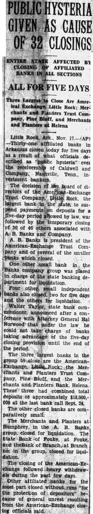 HYSTERIA GIVEN AS CAUSE 32 CLOSINGS ENTIRE STATE AFFECTED BY CLOSING OF AFFILIATED BANKS IN SECTIONS ALL FOR FIVE DAYS Three Largest Close Are Americal Exchange, Little Rock; Merchants and Planters Trust Company, Pine Bluff, and Merchants and Planters at Helena Little Rock, Ark., Nov. affiliated banks in Arkansas ciosed today for five days as a result of what officials described as "public hysteria" over the receivership of Caldwell and Company, Nashville, Tenn., investment bankers. The decision of the board of directors of the Exchange Trust Company, Little Rock, the largest the state, to suspend payments deposits for five-day period allowed by law, was followed by the temporary closing of of 46 others associated with A. Banks and Company. A. B. Banks is president of the American-Exchange Trust Company and of several of the smaller banks which closed One other small bank in the Banks company group was placed in charge of the state banking department liquidation. Four other small independent banks also closed, two for five days and the others for liquidation. Walter Taylor, state bank commissioner, announced after a conference with Attorney General Hal Norwood that under the law he could not take charge of banks taking advantage of the five-day closing provision until the end of the period. The three largest banks in the group are the AmericanExchange, Little Rock; the Merchants and Planters Trust Company, and the Merchants Planters Bank, Helena. These three had combined total deposits of approximately $18,000,000 at the last bank call Sept. 24. The other closed banks are comparatively small: The Merchants and Planters at Humphrey, in the A. B. Banks for liquidation. The State Bank of Fouke, at Fouke, and theBank of Branch, a Branch not in the group, closed for liquidation. closing of the American-Exchange followed heavy withdrawals during the past few days. Other affiliated banks for the most part closed the protection of depositors" because of general unrest resulting from the closing officials