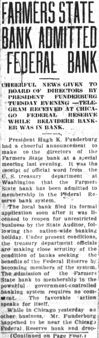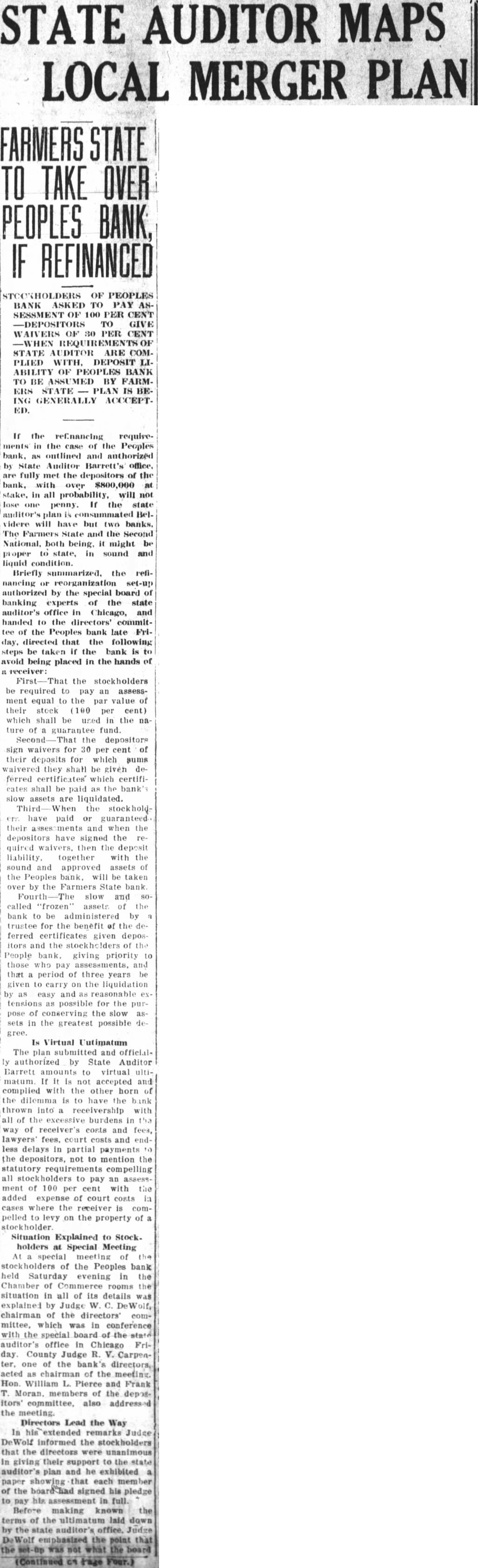 STATE AUDITOR MAPS LOCAL MERGER PLAN FARMERS STATE TO TAKE OVER PEOPLES BANK, IF REFINANCED STCOWHOLDERS OF PEOPLES BANK ASKED TO PAY ASSESSMENT OF 100 PER CENT -DEPOSITORS TO GIVE WAIVERS OF 30 PER CENT STATE AUDITOR ARE COMPLIED WITH, DEPOSIT LIABILITY OF PEOPLES BANK TO BE ASSUMED BY FARMERS STATE PLAN IS BEING GENERALLY ACCCEPTED. If the ref.nancing requirements in the case of the Peoples bank, as ontlined and authorized by State Auditor Barrett's office. are fully met the depositors of the bank, with over $800,000 at stake, in all probability, will not lose one penny. If the state anditor's plan is consummated Belvidere will have but two banks. The Farmers State and the Second National, both being, it might be proper to state, in sound and liquid condition. Briefly summarized, the refinancing or reorganization set-up authorized by the special board of banking experts of the state auditor's office in Chicago, and handed to the directors' committee of the Peoples bank late Friday directed that the following steps be taken if the bank is to avoid being placed in the hands of First-That the stockholders be required to pay an assessment equal to the par value of their stock (100 per cent) which shall be used in the na ture of a guarantee fund. Second- That the depositors sign waivers for 30 per cent of their deposits for which sums waivered they shall be given deferred certificates which certificates shall be paid as the bank's slow assets are liquidated. Third When the stockhold ers. have paid or guaranteed their ments and when the depositors have signed the required waivers. then the deposit liability. together with the sound and approved assets of the Peoples bank. will be taken over by the Farmers State bank Fourth-The slow and socalled "frozen" assets of the bank to be administered by trustee for the benefit of the deferred certificates given depositors and the stockholders of the People bank. giving priority to those who pay assessments, and that a period of three years be given to carry on the liquidation by as easy and as reasonable extensions as possible for the purpose of conserving the slow assets in the greatest possible degree. Is Virtual Untimatum The plan submitted and officially authorized by State Auditor Barrett amounts to virtual ultimatum. If It is not accepted and complied with the other horn of the dilemma is to have the bank thrown into a receivership with all of the excessive burdens in the way of receiver's costs and fees, lawyers' fees, court costs and endless delays in partial payments to the depositors, not to mention the statutory requirements compelling all stockholders to pay an assessment of 100 per cent with the added expense of court costs in cases where the receiver is compelled to levy on the property of a Situation Explained to Stock. holders at Special Meeting At a special meeting of the stockholders of the Peoples bank held Saturday evening in the Chamber of Commerce rooms the situation in all of its details was explained by Judge W. C. DeWolf, chairman of the directors' committee, which was in conference with the special board of the state auditor's office in Chicago Friday. County Judge R. V. Carpenter, one of the bank's directors, acted as chairman of the meeting. Hon William L. Pierce and Frank T. Moran. members of the depositors' committee, also addressed the meeting. Directors Lead the Way In his extended remarks Judge DeWolf informed the stockholders that the directors were unanimous in giving their support to the state auditor's plan and he exhibited a paper showing that each member of the board had signed his pledge to pay his assessment in full. Before making known the terms of the ultimatum laid down by the state auditor's office. Judge emphasized the point that the not what the (Continued Page
