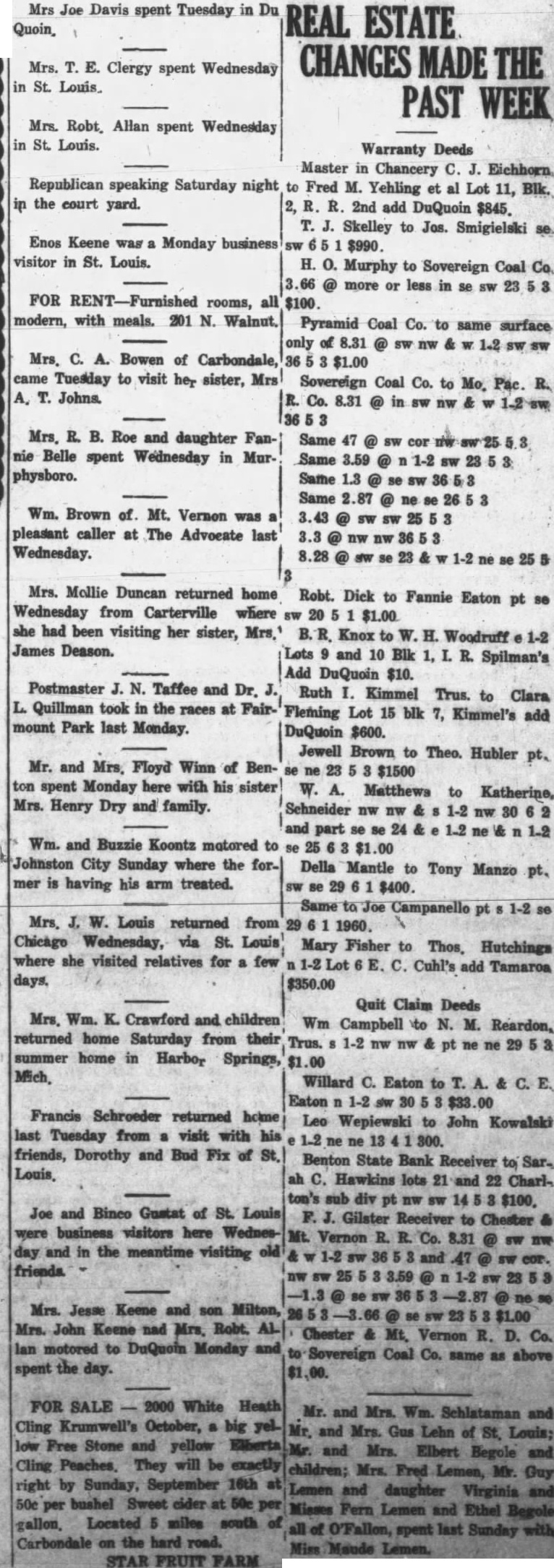 Mrs Joe Davis spent Tuesday in Du Quoin, Mrs. T. E. Clergy spent Wednesday in St. Louis, Mrs. Robt. Allan spent Wednesday in St. Louis. REAL ESTATE CHANGES MADE THE PAST WEEK Warranty Deeds Enos Keene was a Monday business visitor in St. Louis. Master in Chancery C. J. Eichhorn Republican speaking Saturday night to Fred M. Yehling et al Lot 11, Blk. in the court yard. 2, R. R. 2nd add DuQuoin $845. T. J. Skelley to Jos. Smigielski se. SW $990. H. O. Murphy to Sovereign Coal Co. 3.66 @ more or less in se SW 23 FOR RENT-Furnished rooms, all $100. modern, with meals. 201 N. Walnut. Pyramid Coal Co. to same surface only of 8.31 @ SW nw & W 1.2 SW SW Mrs. C. A. Bowen of Carbondale, 36 5 3 $1.00 came Tuesday to visit her sister, Mrs Sovereign Coal Co. to Mo. Pac. R. A, T. Johns. R. Co. 8.31 @ in SW nw & W 1-2 sw 36 3 Mrs. R. B. Roe and daughter Fannie Belle spent Wednesday in Murphysboro. Wm. Brown of. Mt. Vernon was a pleasant caller at The Advoeate last Wednesday. Same 47 @ SW cor Same 3.59 @ n 1-2 SW Same 1.3 @ se Same 2.87 @ ne se 3.43 @ SW SW 3.3 @ nw nw 8.28 @ s/w se Postmaster J. N. Taffee and Dr. J. L. Quillman took in the races at Fairmount Park last Monday. Mr. and Mrs. Floyd Winn of Benton spent Monday here with his sister Mrs. Henry Dry and family. Wm. and Buzzie Koontz motored to Johnston City Sunday where the former is having his arm treated. Mrs. Mollie Duncan returned home Robt. Dick to Fannie Eaton pt se Wednesday from Carterville where SW 20 5 1 $1.00 she had been visiting her sister, Mrs. Knox to W. H. Woodruff e 1-2 James Deason. Lots 9 and 10 Blk 1, I. R. Spilman's Add DuQuoin $10. Ruth I. Kimmel Trus. to Clara Fleming Lot 15 blk 7, Kimmel's add DuQuoin $600. Jewell Brown to Theo. Hubler pt. se ne 23 5 3 $1500 W. A. Matthews to Katherine, Schneider nw nw S 1-2 nw 30 6 2 and part se se e ne se 25 $1.00 Della Mantle to Tony Manzo pt. SW se 29 6 $400. Same to Joe Campanello pt S 1-2 se Mrs. J. W. Louis returned from 29 6 1960. Chicago Wednesday, via St. Louis Mary Fisher to Thos, Hutchings where she visited relatives for a few n 1-2 Lot 6 E. C. Cuhl's add Tamaroa days. $350.00 Mrs. Wm. K. Crawford and children returned home Saturday from their summer home in Harbor Springs, Francis Schroeder returned hcme last Tuesday from a visit with his friends, Dorothy and Bud Fix of St. Louis, Joe and Binco Gustat of St. Louis were business visitors here Wednesday and in the meantime visiting old Mrs. Jesse Keene and son Milton, Mrs. John Keene nad Mrs. Robt. AL lan motored to DuQuoin Monday and spent the day. FOR SALE 2000 White Heath Cling Krumwell's October, a big yel. low Free Stone and yellow Elberta Cling Peaches, They will be exactly right by Sunday, September 16th at 50e per bushel Sweet cider at 50c per gallon, Located 5 miles south of Carbondale on the hard road. STAR FRUIT FARM Quit Claim Deeds Wm Campbell to N. M. Reardon, Trus. S 1-2 nw nw & pt ne ne 29 a $1.00 Willard C. Eaton to T. A. & C. Eaton n 1-2 s/w 30 5 3 $33.00 Leo Wepiewski to John Kowalski 1-2 ne ne 13 300. Benton State Bank Receiver to Sarah C. Hawkins lots 21 and 22 Charlton's sub div pt nw SW 5 $100, F. J. Gilster Receiver to Chester & Mt. Vernon R. R. Co. 8.31 @ SW nw & W 1-2 SW 36 and .47 @ SW cor. nw SW 1-2 SW 66 SW Chester & Mt. Vernon R. D. Co. to Sovereign Coal Co. same as above Mr. and Mrs. Wm. Schlataman and Mr. and Mrs. Gus Lehn of St. Louis; Mr. and Mrs. Elbert Begole and children; Mrs. Fred Lemen, Mr. Guy Lemen and daughter Virginia and Misses Fern Lemen and Ethel Begole all of O'Fallon, spent last Sunday with Miss Maude Lemen.