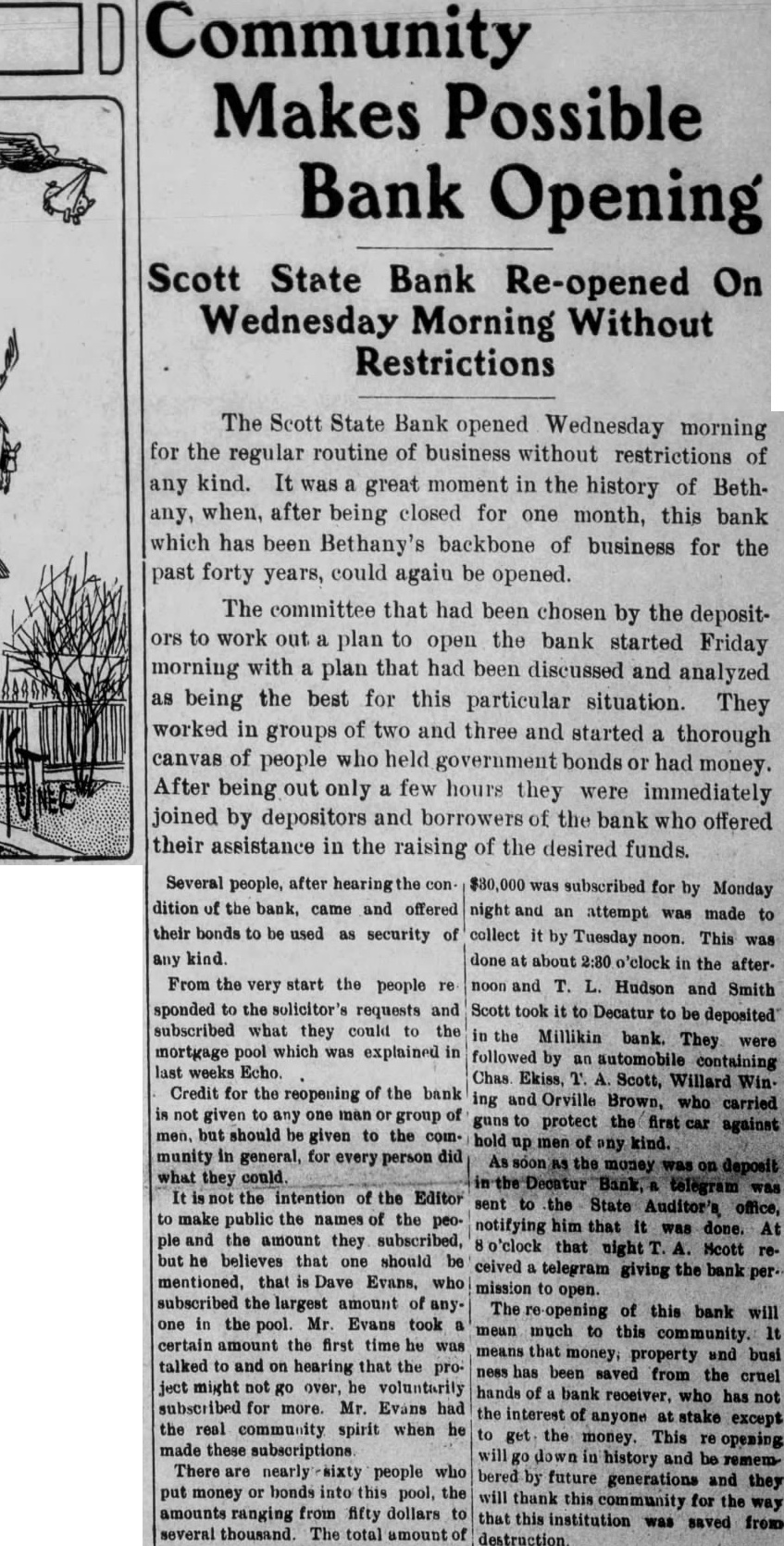Community Makes Possible Bank Opening Scott State Bank Re-opened On Wednesday Morning Without Restrictions The Scott State Bank opened Wednesday morning for the regular routine of business without restrictions of any kind. It was a great moment in the history of Bethany, when, after being closed for one month, this bank which has been Bethany's backbone of business for the past forty years, could again be opened. The committee that had been chosen by the depositors to work out a plan to open the bank started Friday morning with a plan that had been discussed and analyzed as being the best for this particular situation. They worked in groups of two and three and started a thorough canvas of people who held government bonds or had money. After being out only a few hours they were immediately joined by depositors and borrowers of the bank who offered their assistance in the raising of the desired funds. Several people, after hearingth condition of the bank, came and offered their bonds to be used as security of any kind. From the very start the people re sponded to the solicitor's requests and subscribed what they could to the mortgage pool which was explained in last weeks Echo. Credit for the reopening of the bank is not given to any one man or group of men, but should be given to the community in general, for every person did what they could. It is not the intention of the Editor to make public the names of the people and the amount they subscribed, but he believes that one should be mentioned, that is Dave Evans. who subscribed the largest amount of anyone in the pool. Mr. Evans took a certain amount the first time he was talked to and on hearing that the project might not go over, he voluntarily subscribed for more. Mr. Evans had the real community spirit when he made these subscriptions There are nearly sixty people who put money or bonds into this pool, the amounts ranging from fifty dollars to several thousand. The total amount of $80,000 was subscribed for by Monday night and an attempt was made to collect it by Tuesday noon. This was done at about 2:30 o'clock in the afternoon and T. L. Hudson and Smith Scott took it to Decatur to be deposited in the Millikin bank. They were followed by an automobile containing Chas Ekiss, T. A. Scott, Willard Win ing and Orville Brown, who carried guns to protect the first car against hold up men of any kind. As soon as the money was on deposit in the Decatur Bank, a telegram was sent to the State Auditor's office, notifying him that it was done. At o'clock that night T. A. Mcott received a telegram giving the bank per. mission to open. The opening of this bank will mean much to this community. It means that money, property and busi ness has been saved from the cruel hands of bank receiver. who has not the interest of anyone at stake except to get the money. This re opening will go down in history and be remembered by future generations and they will thank this community for the way that this institution was saved from