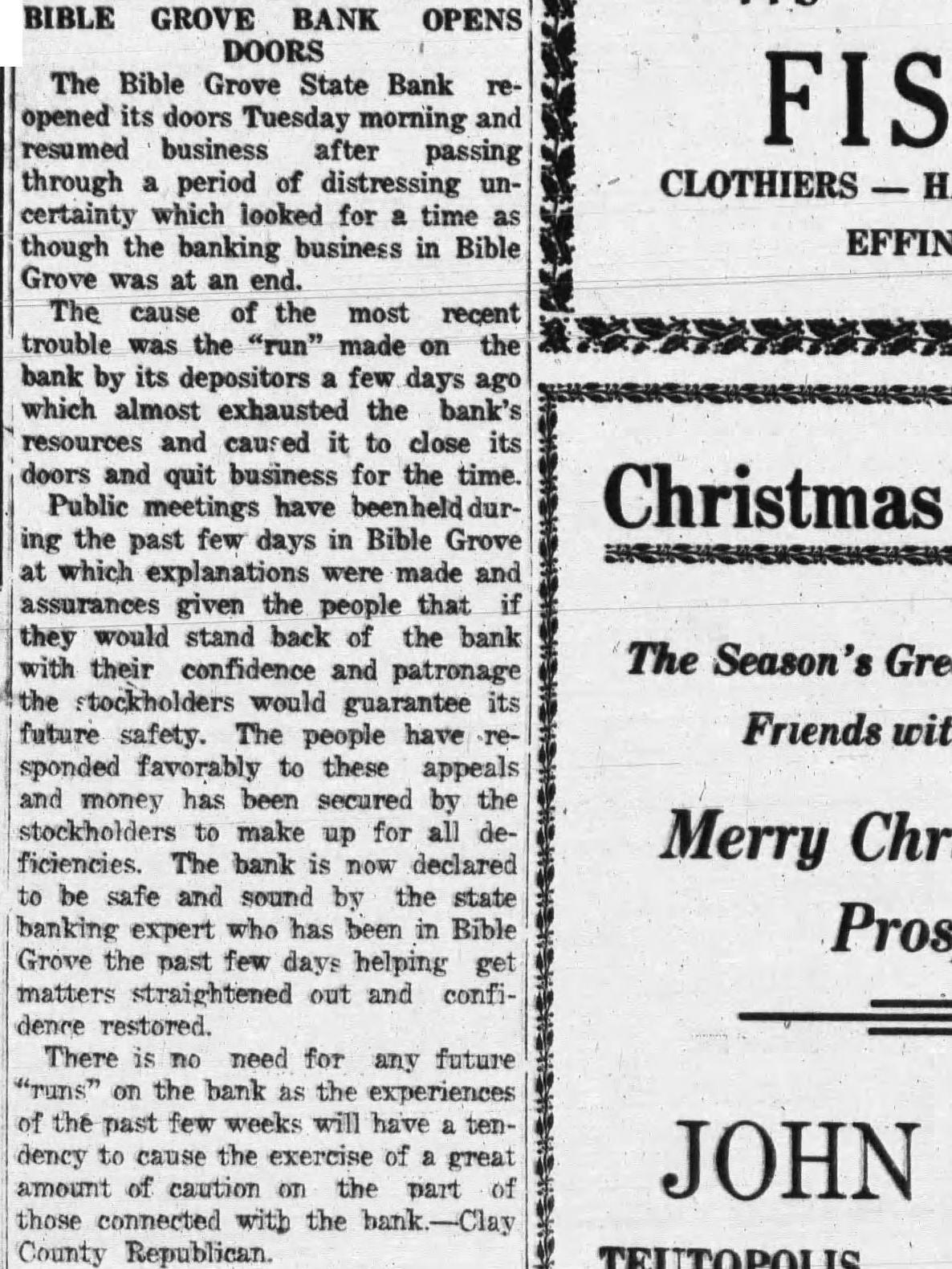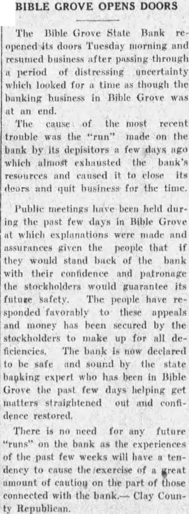 Public meetings have been held ing the past few days in Bible Grove at which explanations were made and assurances given the people that if they would stand back of the bank with their confidence and patronage the stockholders would guarantee its future safety. The people have sponded favorably to these appeals and money has been secured by the stockholders to make up for all ficiencies. The bank is now declared to be safe and sound by the state banking expert who has been in Bible Grove the past few days helping get matters straightened out and confidence restored.