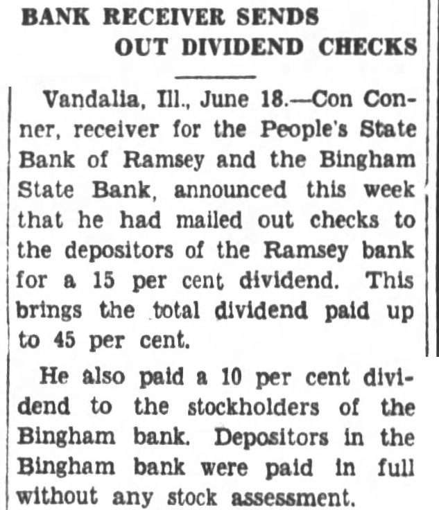 BANK RECEIVER SENDS OUT DIVIDEND CHECKS Vandalia, Ill., June Conner, receiver for the People's State Bank of Ramsey and the Bingham State Bank announced this week that he had mailed out checks to the depositors of the Ramsey bank for 15 per cent dividend. This brings the total dividend paid up to 45 per cent. He also paid 10 cent diviper dend to the stockholders of the Bingham bank. Depositors in the Bingham bank were paid in full without any stock assessment.
