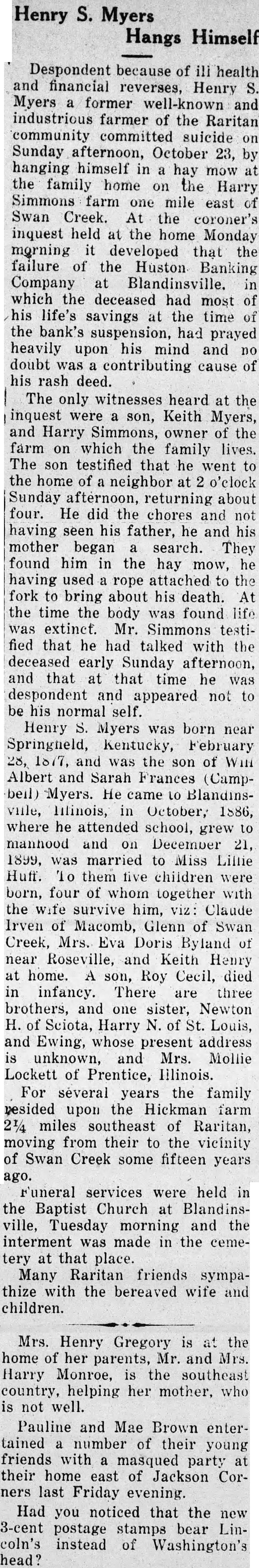 Henry S. Myers Hangs Himself Despondent because of ili health and financial reverses, Henry S. Myers a former well-known and industrious farmer of the Raritan community committed suicide on Sunday afternoon, October 23, by hanging himself in a hay mow at the family home on the Harry Simmons farm one mile east of Swan Creek. At the coroner's inquest held at the home Monday morning it developed that the failure of the Huston Banking Company at Blandinsville. in which the deceased had most of his life's savings at the time of the bank's suspension, had prayed heavily upon his mind and no doubt was a contributing cause of his rash deed. The only witnesses heard at the inquest were a son, Keith Myers, and Harry Simmons, owner of the farm on which the family lives. The son testified that he went to the home of a neighbor at 2 o'clock Sunday aftérnoon, returning about four. He did the chores and not having seen his father, he and his mother began a search. They found him in the hay mow, he having used a rope attached to the fork to bring about his death. At the time the body was found life was extinct. Mr. Simmons testified that he had talked with the deceased early Sunday afternoon, and that at that time he was despondent and appeared not to be his normal self. Henry S. Myers was born near Springheld, Kentucky, February 28, 1877, and was the son of Will Albert and Sarah Frances (Campbeil) Myers. He came to Blandinsviile, Illinois, in October; 1886, where he attended school, grew to manhood and on December 21, Huff. To them five children were and born, four of whom together with the wife survive him, viz: Claude Irven of Macomb, Glenn of Swan Creek, Mrs. Eva Doris Byland of near Roseville, and Keith Henry at home. A son, Roy Cecil, died in infancy. There are three brothers, and one sister, Newton H. of Sciota, Harry N. of St. Louis, and Ewing, whose present address is unknown, and Mrs. Mollie Lockett of Prentice, Illinois. For several years the family resided upon the Hickman farm 21/4 miles southeast of Raritan, moving from their to the vicinity of Swan Creek some fifteen years ago. Funeral services were held in the Baptist Church at Blandinsville, Tuesday morning and the interment was made in the cemetery at that place. Many Raritan friends sympathize with the bereaved wife and children. Mrs. Henry Gregory is at the is not well. Pauline and Mae Brown entertained a number of their young friends with a masqued party at their home east of Jackson Corners last Friday evening. Had you noticed that the new head