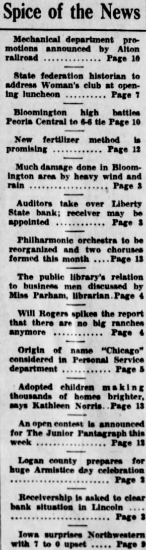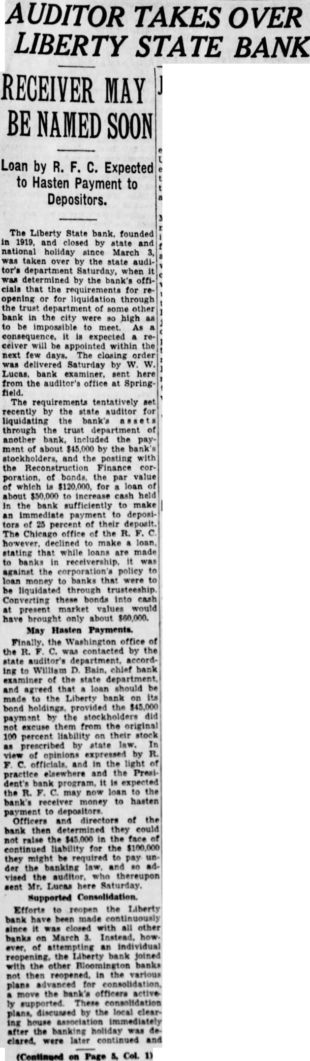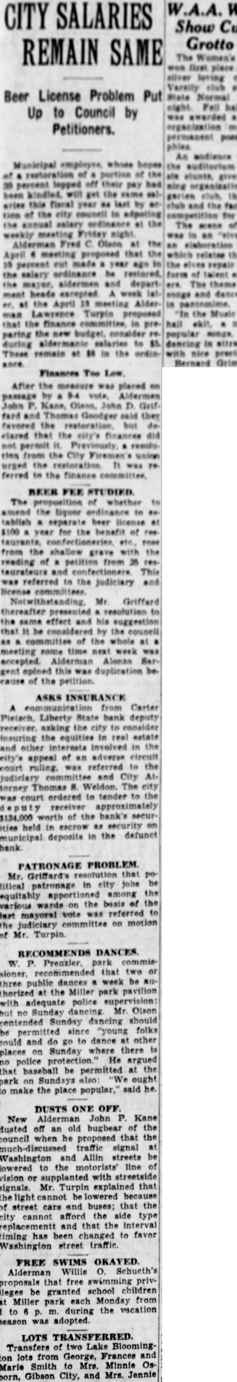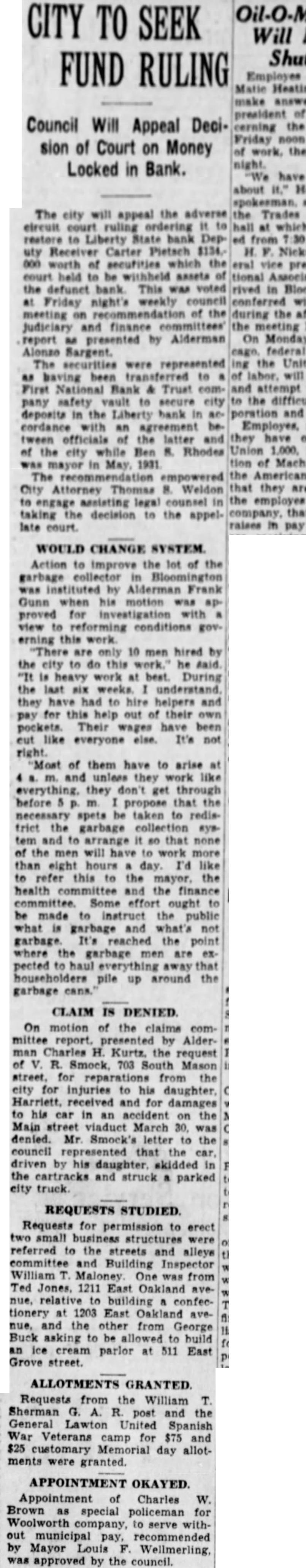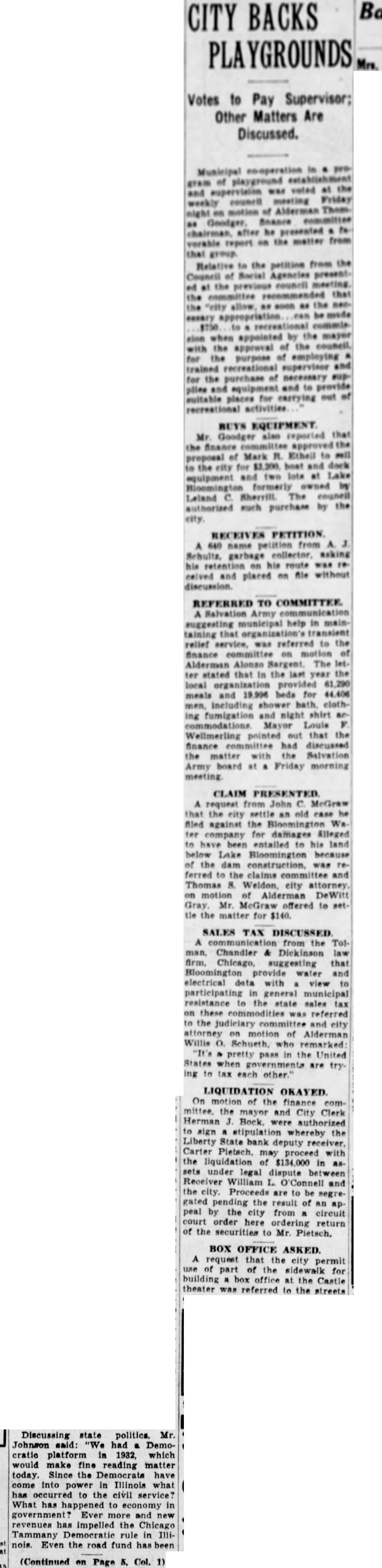 "Although the Liberty bank had not succeeded in getting these bonds renewed at that time, it was hopeful of doing so. Since the law at the time entitled the city to this protection and since the bank was unable to get It, in lieu, the city took depositors securities and this can hardly be construed as having been secret agreement. "It should be borne in mind that these securities were not like collateral under that agreement. The agreement specifies they were held in trust by both the city and the bank and that the deposit box could be opened only in the presence of the designated representatives of "The state law has been changed so that municipalities may no longer require depositors' bonds and it also relieves the city treasurer from liability in case of loss, even though he may have recommended a bank as depository." brothers. Mrs. Roth is the daughter of Mr. and Mrs. Millikan. The winners of the Night Bridge club during the last six months entertained the losers at the home of Mrs. Fred Dale Monday night There was potluck supper and three tables of bridge. William Thom pson has been quite ill at his home for several days Drs. Lee and Cecil Thompson of Streator spent Sunday with Mr. and Mrs. Thompson. Miss Carmelita Basso, teacher of the Leonard school, spent the weekend at her home at Athens. Mrs. M. A. Hornbeck of Chicago came Sunday to spend an indefinite time with W. Thomas and his family Mrs. Thomas is daughter of Mrs. Hornbeck Mr. and Mrs. L. C. Hornbeck of Bloomington visited here Sunday Fred Scholl of Joliet returned Tuesday after visiting relatives here last week. He spent the week end in Rockford visiting at the home of his brother, William