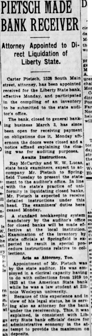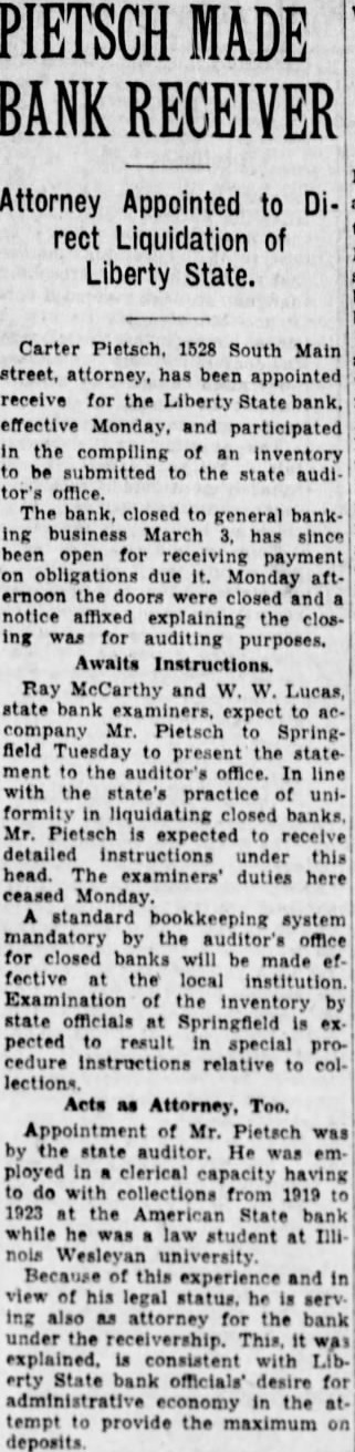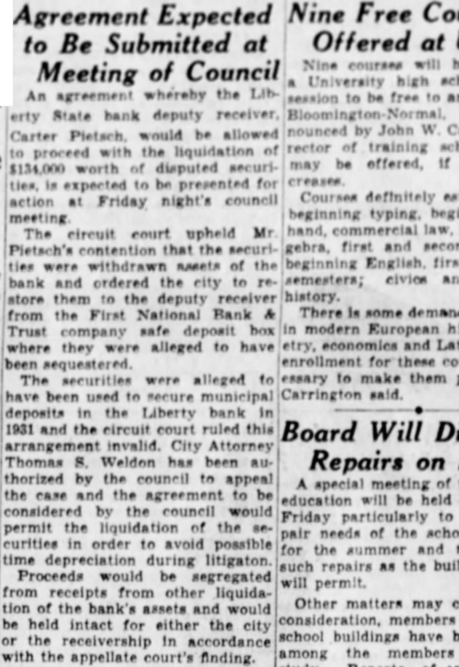 "The depositors of the Liberty State bank," Mr. Pietsch told Pantagraph reporter, "are entitled to as much protection as the municipality. The appellate court's opinion in the case of the People ex rel. Nelson versus Seward State bank. handed down in October, 1932, held such secret agreement invalid and void.