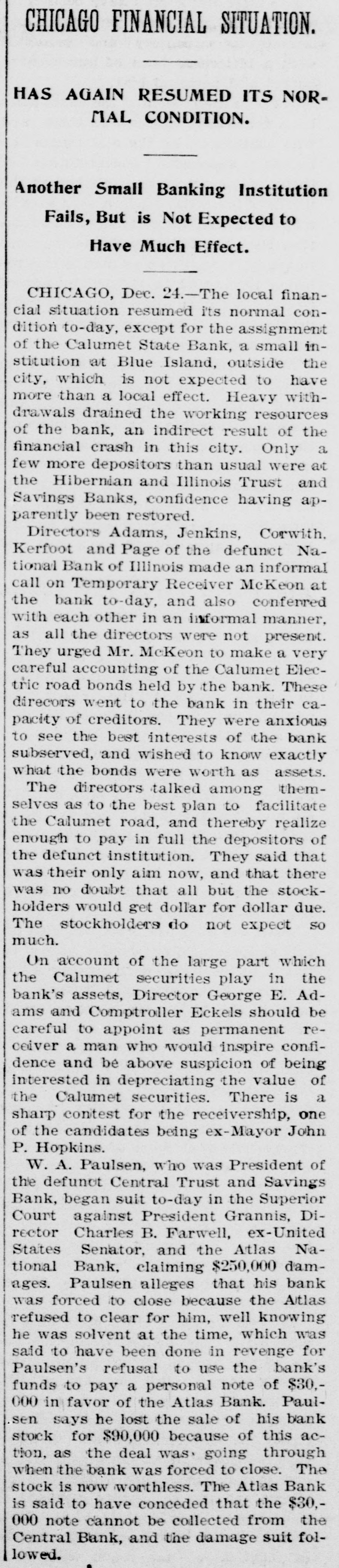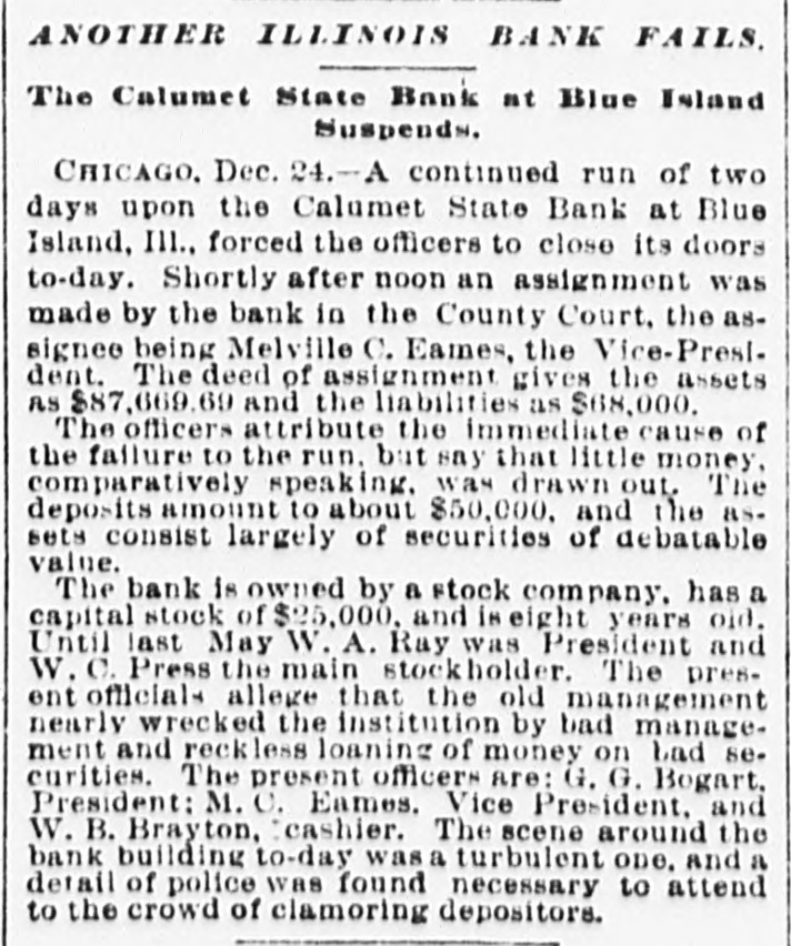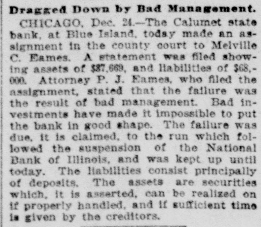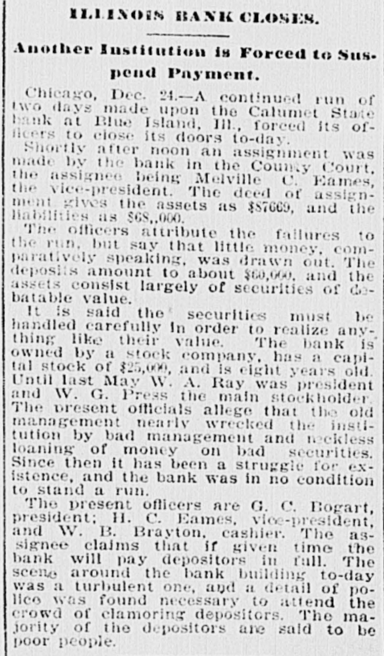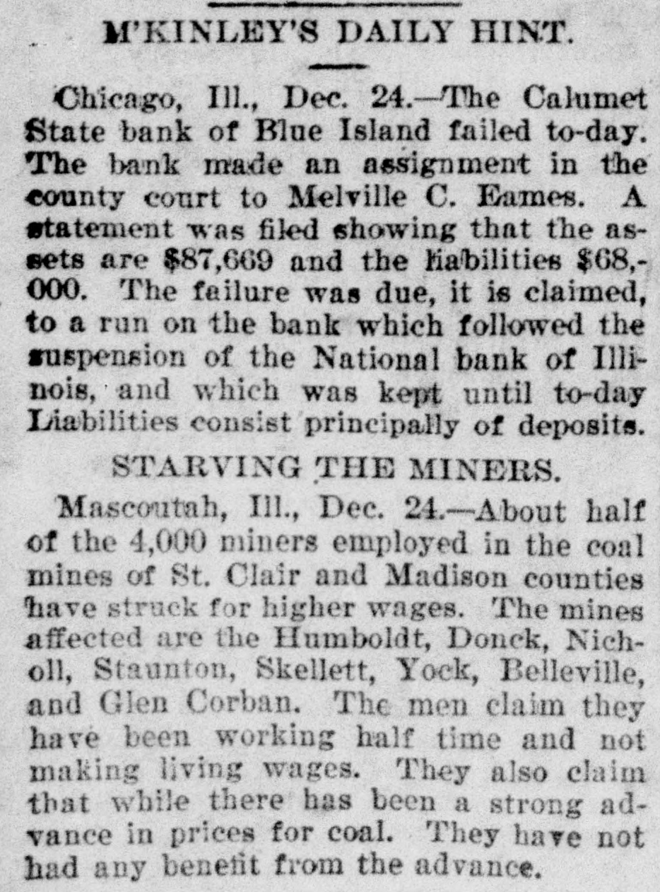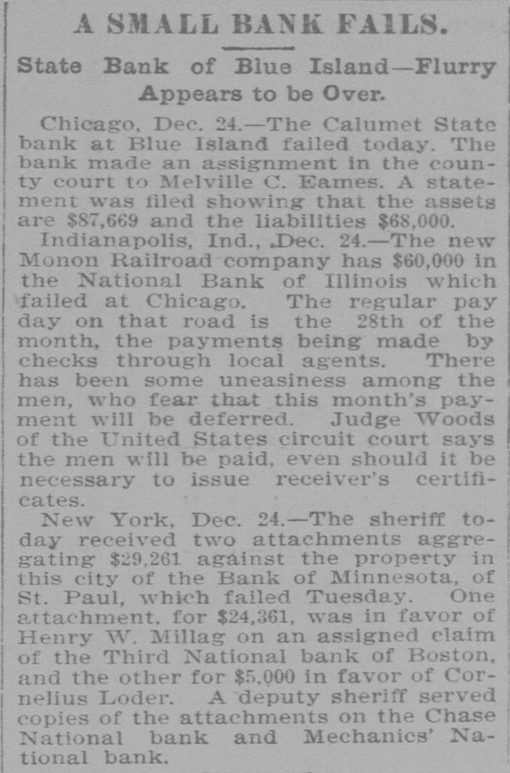 Two children of Mrs. Christine Carlisle, Tommy, aged two, and Ruth, aged four, were burned to death at Wakefield, O. The mother had locked them in the house and gone to a neighbors. Fire destroyed two buildings at the state reformatory in Elmira, N. Y., entailing a loss of $100,000. In Chicago the George A. Weiss Malting and Elevator company failed for $500,000, and Angus & Gindele, contractors, for $250,000. Scott Wike, of Illinois, assistant secretary of the United States treasury, has resigned. James Preston, aged 40, shot his wife, Amanda, aged 37, and the latter's son, William Bryant, aged 19, in Cincinnati, and then shot himself. Domestic trouble was the cause. Mrs. J. Suppler's sugar house at White Castle, La., was destroyed by fire, together with 3,500 barrels of sugar, the loss being $200,000. The annual statement of railroad construction shows that during 1896 only 1,802 miles of lines were built in the United States, the smallest mileage in any year since 1875. The New England Society of the City of New York celebrated the ninety-first anniversary of its organization and the two hundred and seventy-sixth of the landing of the pilgrims. Walbridge & Co.'s hardware and house furnishing establishment in Buffalo, N. Y., was damaged by fire to the extent of about $150,000. The remains of Kate Field arrived in San Francisco from Honolulu. They will be cremated and the ashes sent east for burial. Allen Creer and the wife and daughter of Rud Owens were drowned in Clarks river near Paducah, Ky., by the capsizing of a boat. The Bank of West Superior, Wis., capital $50,000 and $50,000 surplus, suspended because of the failure of the National bank of Illinois in Chicago. J. D. Williams, a mulatto, shot his wife and then killed himself in Washington. Hon. William J. Bryan opened his lecture tour at Atlanta, Ga., his subject being "The Ancient Landmarks." Mrs. Henry Bond and Miss Tyrrell, sisters, living at Woodbourne, Pa., were killed by the cars at a crossing. A train on the Chicago & Alton road was held up by robbers near Independence, Mo., and the express car looted. The American Banking and Trust company of Auburn, Me., closed its doors with liabilities of $55,000. Solomon Sayles, wholesale meat dealer in New York. failed for $250,000. Mrs. H. Estby and her daughter Clara, 19 years old, arrived in New York from Spokane, Wash., having walked the entire distance since May 5 on a wager that they could cross the continent in seven months. A large portion of the business section of Somerset, Ind., was wiped out by fire. The Parsons-Pelletier Dry Goods company, one of the largest houses of the kind in Sioux City, la., failed for $100,000. The wife of Noah Scott, of Shelbyville, Ind., gave birth to four boys and all were doing well. An explosion of nitro-glycerin near Montpelier, Ind., killed George Hickok and Harry Wood and greatly damaged the property of the Empire Glycerin company. President Cleveland has approved the general pension and urgent deficiency appropriation bills. By the explosion of a steam pipe in the city hall in Baltimore James Reilly and Charles Robertson were fatally scalded. W. H. Jones, county treasurer of BarΓy county, Mo., for the past four years, is said to be short $13,000 in his accounts. There were 287 business failures in the United States in the seven days ended on the 25th, against 367 the week previous and 322 in the corresponding period of 1895. Miss Anna Held, the French actress, who is playing at the Grand opera house in Pittsburgh, sang on the public streets of the city for the benefit of a charitable institution and over $800 was poured into her carriage. Fire destroyed the Huffman house block in Rockford, III., the total loss being $175,000. The home of Philip McKim, near Franklin. Pa., was burned and three little children perished in the flames. The Columbia, known as the old Doxey theater building, was burned at Anderson, Ind., the loss being $90,000. The Calumet state bank at Blue Island, III., closed its doors with liabilities of $70,000. Jay Van Seyoe and Earl Campbell. two young men of Valley, Neb., were drowned while skating on a lake.