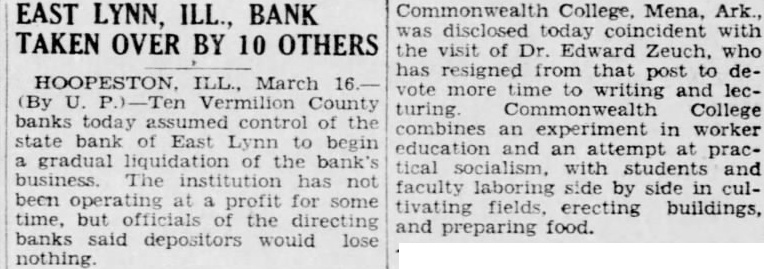 EAST LYNN, ILL., BANK TAKEN OVER BY 10 OTHERS (By U. P.)-Ten Vermilion County banks today assumed control of the state bank of East Lynn to begin a gradual liquidation of the bank's business The institution has not been operating at a profit for some time, but officials of the directing banks said depositors would lose nothing. Commonwealth College, Mena, Ark. was disclosed today coincident with the visit of Dr. Edward Zeuch, who has resigned from that post to devote more time to writing and lecturing Commonwealth College combines an experiment in worker education and an attempt at practical socialism, with students and faculty laboring side by side in cultivating fields, erecting buildings, and preparing food.