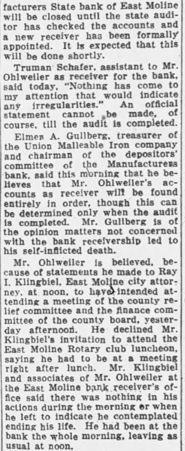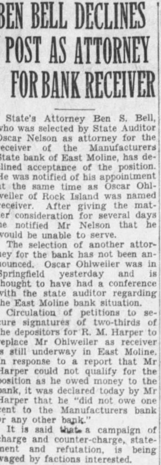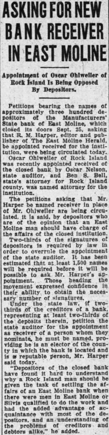 Manufacturers State Bank of East covered None 52,073.41 and advancefund. receipts loss settlement state 7,055.93 expense expense 3,800.96 expense 2,730.12 spe300.00 and 170,000.00 bank building pense) 10,288.13 Total hands receiver Total Interest account Total collections from Receiver's Accountant' fee expense, in hands Total from bank 15% cent common assessment liability suit, the sum of been from the former this bank and the hands the disbursement at early date. Dividend Payments In the case of the Peoples SavBank Trust per cent has to the general claimants against bank. the Moline State Trust Savings Bank, paid to date. In the case of the State Bank East Moline 15 cent has been paid from the ceipts of assets of from the bank stockholders' Fifth Avenue Trust Savings Bank has paid 20 per in dividends from the stock assessment the cial Bank paid per in the and stock fund. The attorney for Peoples Savings Bank Clyde Walker and the case the Moline State Trust Savings Bank, Sinnett Britton counsel ceiver. James M. Johnston torney Manufacturers State Bank of East Moline, Railsback Fifth Trust Savings Bank Sinnett Britton recently Harper, former attorney for the the SavBank, resigned when William O'Connell took charge this bank. premiums and interest 64,536.92 3,311.48 receipts by 55,612.12 state 10,050.00 salary expense stenographer expense 16,259.96 expense 3,503.87 banking spe960.00 rediscounts 47,288.27 bills payadvancements, Total in hands receiver Total Stockholders' Liability RECEIPTS holders Receiver's and Balance in hands receiver Total paid from bank 16% assessment None