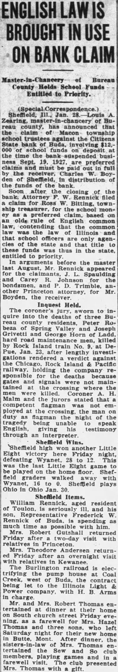 Inquest Held. The to quire into the deaths of three Bureau county residents, Peter Robeza Spring Valley and Grivetti and George Horn of Ladd, road killed men, by Rock Island train No. DePue, Jan. 23, after lengthy investigations verdict against the Rock Pacific railway. the company sponsible for the deaths because gates and signals were not maintained crossing where the killed. Coroner H. Malm and the jurors stated that competent flagman was not employed the crossing, the man duty flagman the night of the tragedy being unable speak English, giving his testimony through an interpreter. Sheffield Wins. Sheffield high another Little Eight here Friday night, defeating Wyanet. 28 to 12. This was last Little Eight game to be played on the home floor Sheffield graders walked away with Wyanet, Sheffield plays Ohio in Ohio Jan. 30. Sheffield Items. William Rennick. aged resident of Toulon. seriously his Frederick Rennick Buda. spending much time as possible with him. Mrs. Robert Gutshall returned Friday after two-day visit with relatives Princeton. Mrs. Theodore Andersen returnFriday after an overnight visit relatives Kewanee. The Burlington railroad is electrifying the pump house Coal Creek, west Buda, the contract being let to the Illinois Light Power company, with H. Arms in charge Mr. Mrs. Robert Thomas tertained dinner their home on South church street Friday ning. farewell for Mrs. Hazel Thomas and three sons, who left Saturday night for their home in Butte, Mont After dinner, the of Mrs. Thomas tertained the Sew and So club members, playing games and farewell visit. The club presented Mrs. Thomas with gift.