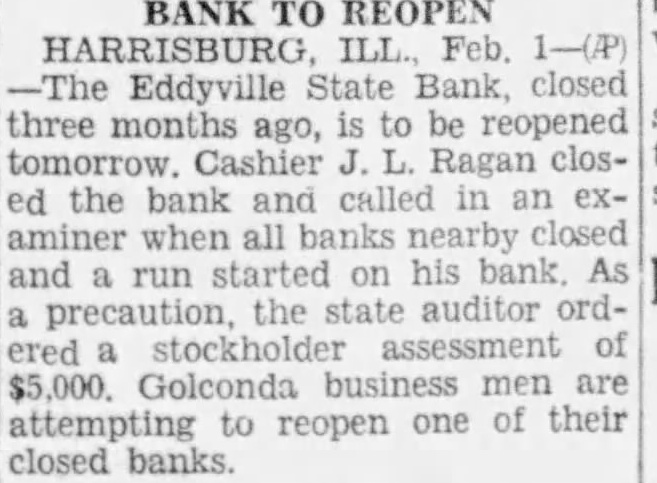 FLOUR unchanged In carload lots family patents 4.30-4.40 per barrel in 98 pound Shipments 24,774: pure bran 12.5013.00 Standard middling 11.00-11.50. REOPEN EDDYVILLE BANK HARRISBURG, Ill., Feb. 1-(AP) Eddyville State bank, closed three months ago, is to be reopened tomorrow Cashier Ragan closed the bank and called in examiner when all banks nearby closed and started on his bank As precaution state auditor ordered stockholder assessment $5,000 Golconda business are tempting to reopen one of their closed REPORT MERGER DANVILLE (INS). Merger of the Malleable Company and the Manufacturing of this city announced here today. The Decatur plant will be abandoned and the and working force brought, here, it was reported. CLOSE DUBUQUE BANK DUBUQUE Ia., Feb. (INS)The Dubuque Union Trust and Savings Bank, with deposits of approximately $2,500,000 and capitalization $150,000, failed to open for business today It the second large Dubuque bank close within week. TREASURY BALANCE The treasury net balance Jan was $341 Expenditures that day were $4,052,727.34 Customs receipts for month through Jan 29 were $26,131,864.00 PEORIA GRAIN 1/2c higher: No. yellow 351/2 Oats unchanged; No. white DECLARE DIVIDEND NEW YORK, (UP)-Th4 Corp., representing the mergered Standard Oil Co. and the Vacuum Oil Co., today declared 25 share, payable March 15 to stock of record Feb Following the merger of the last year the paid initial dividend of 40 cents on Sept. 15 and later distributed cents share on Dec. 15.