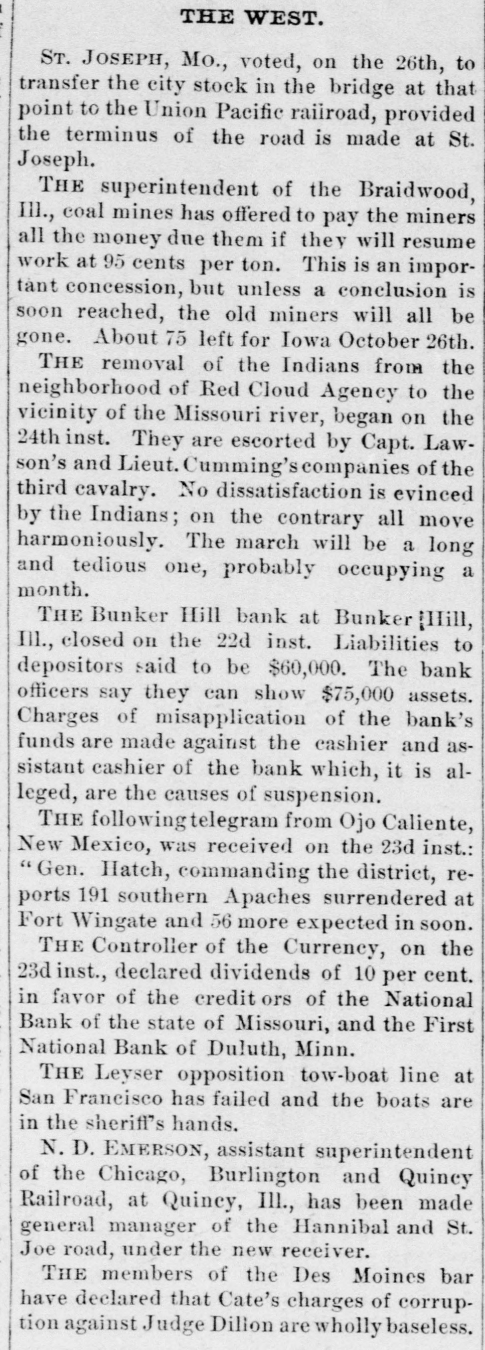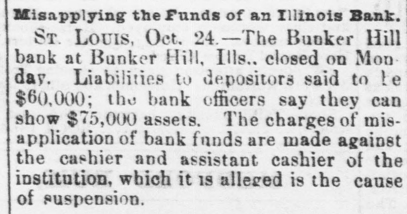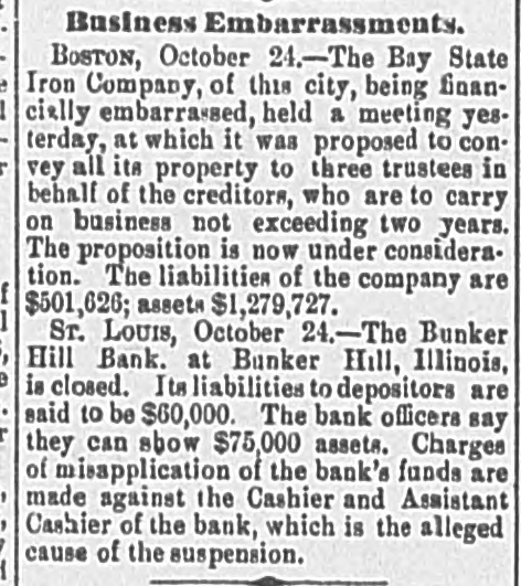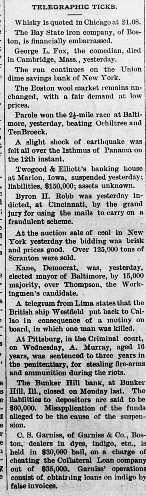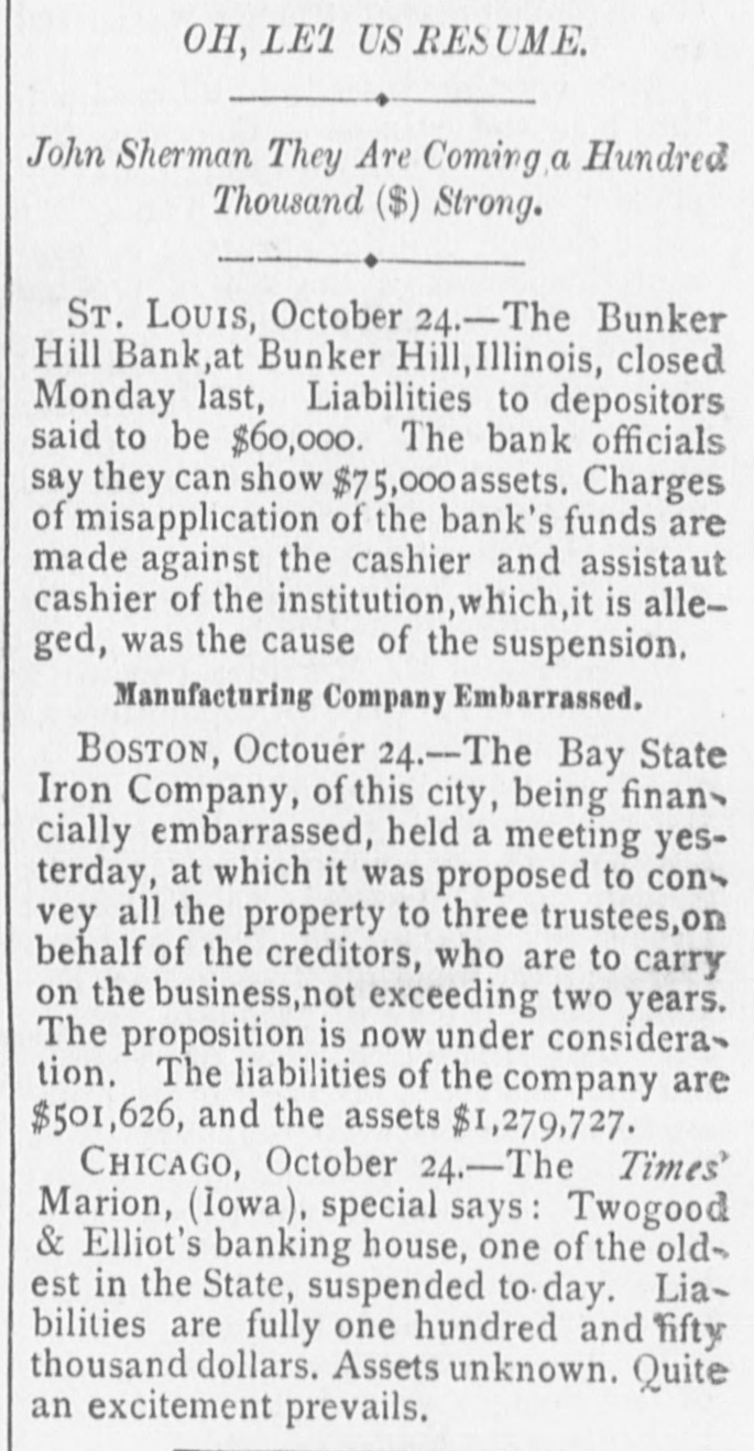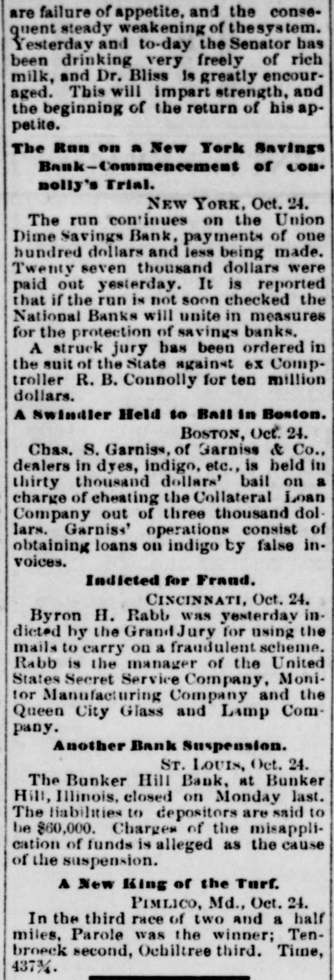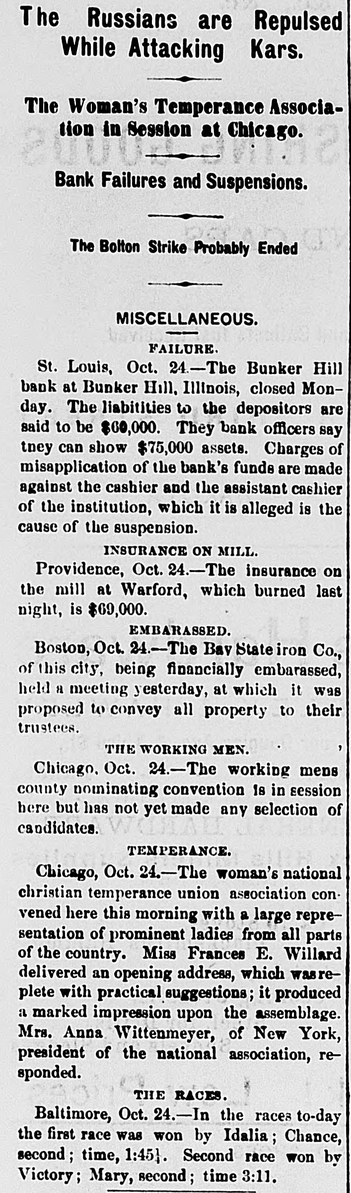The Russians are Repulsed While Attacking Kars. The Woman's Temperance Associalion in Session at Chicago. 2000 e Vila Bank Failures and Suspensions. The Bolton Strike Probably Ended MISCELLANEOUS. FAILURE. St. Louis, Oct. 24-The Bunker Hill bank at Bunker Hill, Illinois, closed Monday. The liabilities to the depositors are said to be $00,000. They bank officers say tney can show $75,000 assets. Charges of misapplication of the bank's funds are made against the cashier and the assistant cashier of the institution, which it is alleged is the cause of the suspension. INSURANCE ON MILL. Providence, Oct. 24.-The insurance on the mill at Warford, which burned last night, is $69,000. EMBARASSED. Boston, Oct. 24.-The Bay Stateiron Co., of this city, being financially embarassed, held a meeting yesterday, at which it was proposed to convey all property to their trustees. , THE WORKING MEN. Chicago. Oct. 24.-The working mens county nominating convention is in session here but has not yet made any selection of candidates. TEMPERANCE. Chicago, Oct. 24.-The woman's national christian temperance union association convened here this morning with a large representation of prominent ladies from all parts of the country. Miss Frances E. Willard delivered an opening address, which wasreplete with practical suggestions; it produced a marked impression upon the assemblage. Mrs. Anna Wittenmeyer, of New York, president of the national association, responded. THE RACES. Baltimore, Oct. 24.-In the races to-day the first race was won by Idalia; Chance, second time, 1:45}. Second race won by Victory; Mary, second; time 3:11.