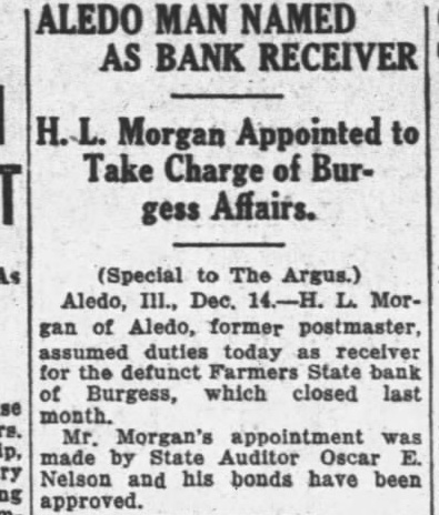 MAN NAMED AS BANK RECEIVER Morgan Appointed to Take Charge of gess Affairs. (Special to The Argus.) Aledo, III., Dec. Morgan of Aledo, former postmaster, assumed duties today receiver for the Farmers State bank of Burgess, which closed last month. Mr. Morgan's appointment made by State Auditor Oscar Nelson and his bonds have been approved.