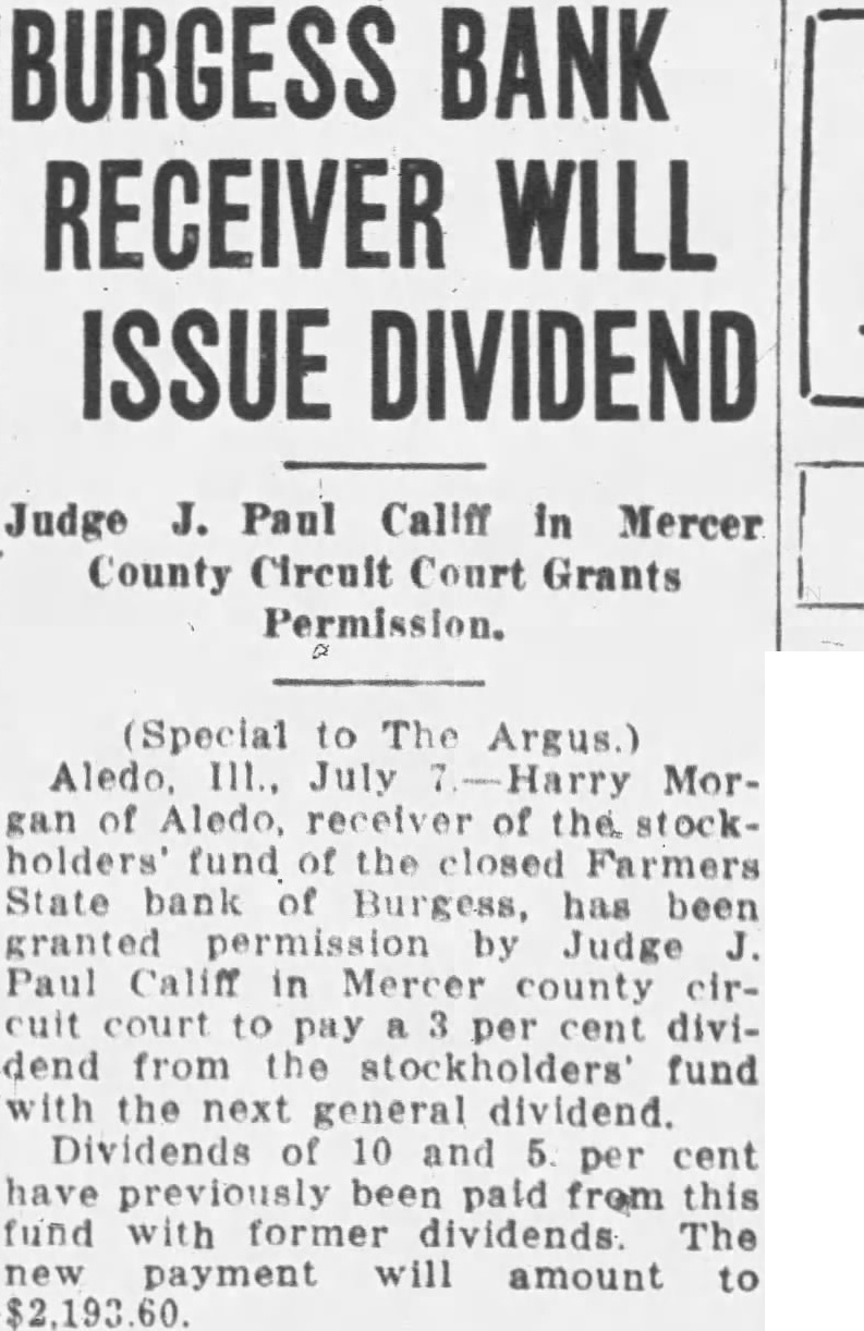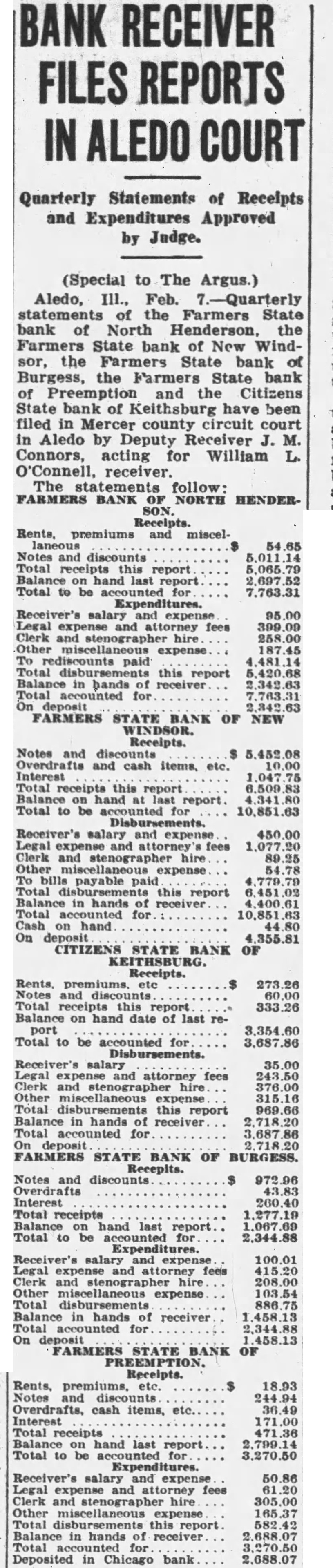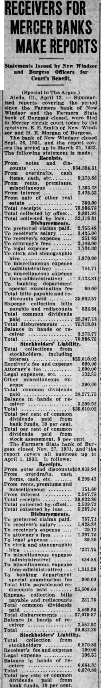 RECEIVERS FOR MERCER Statements Issued by New Windsor and Burgess Officers for Court's Benefit. (Special to Aledo, III., April 12. Summarized reports covering the period since Farmers bank of New Windsor and Farmers State bank Burgess closed, filed Mercer court today receivers, Smith New Windand H. Morgan Burgess. The bank of New Windsor closed Sept. 1931, and the report the period up to 1933. The statement is made: Receipts. From notes and discounts $64,884.31 From overdrafts, cash items, cash, 9,173.66 From rents, premiums. From interest 3,425.53 From sale of other estate 300.00 Total receipts 78,986.78 Total collected by Total collected by loss preferred claims paid. receiver's salary 3,435.00 receiver's expense attorney's fees 2,146.00 legal expense 1,734.30 clerk and stenographic hire 1,970.00 To expense (administrative) 744.71 To miscellaneous expense 1,123.31 banking department special examination 80.00 Total bills payable discounts paid 35,602.57 Expense collection bills payable and rediscounts 522.84 Total common dividends paid Total disbursements 75,713.01 Balance in hands of ceiver Total Stockholders' Liability. Total collections from stockholders. including interest $25,610.02 Receiver's fee and expense Attorney's fee Legal expenses, etc. 132.35 Other miscellaneous expense 390.00 Total common dividends paid 20,277.75 Balance in hands of ceiver 3,209.92 Total $25,610.02 Total per cent of common dividends paid from bank funds, 10 per cent. Total per cent of common dividends from stock per cent. The Farmers State bank of Burgess closed Nov. 1931, report covers all business up April 1933. It follows: Receipts. From notes and From cash items, cash, etc. From rents, 151.60 From interest Total receipts Total collected Total collected by preferred claims paid. 757.71 receiver's salary 1,428.84 receiver's expense 29.12 attorney's fees legal expense 89.30 clerk and stenographic hire To miscellaneous expense (administrative) 434.84 To miscellaneous expense To banking department special examination 200.00 Total bills discounts paid 25,500.00 Expense collection bills payable and rediscounts 231.75 Total common dividends paid Total Balance in hands of receiver Total Stockholders' Liability. Total collection from stockholders 6,870.88 Receiver's expense 100.00 Legal Balance in hands of ceiver 6,664.32 Total 6,870.88 per cent of common dividends paid from bank funds, 10 per cent.