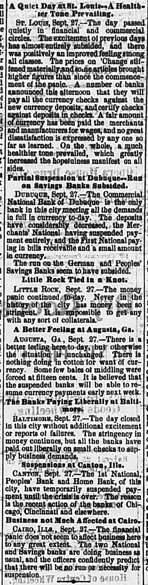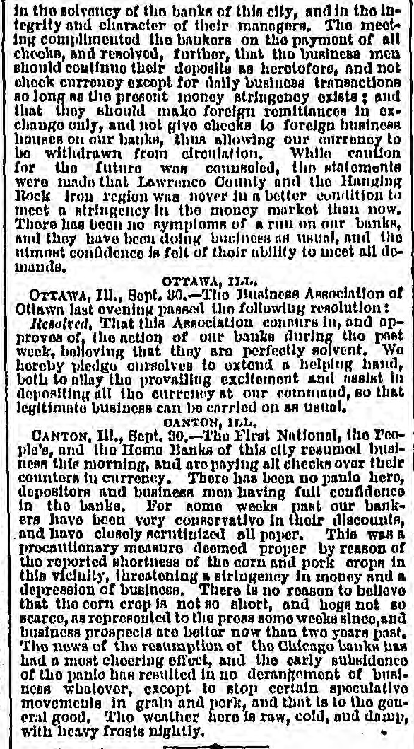 This will throw ILL. out suffering must CARLINVILLT ensue. man of of employment them will 000 or down 800 mon, and great Tribune. of special Dispatch to Sept. The Chicago this meeting city, YOB CARLINV officers LLE, of the III., three to adopt banks the of following their deposit- plan torday, the they agreed of themsolves and no currency on for the bonofit That they pay out This agreement checks ors, viz.: or drafts of Presidonte over $100. or Cashiers of all was signed by the banks are sound. the banks. Our MORRIR, ILL Tribune. Special Dispatch to The 27 Chicago In money mai from tters Monnes Ill., temont, Sept. nothing different cannot buy there is no day, excitem except the checks corn men are paid the by First the or any move other corn. All National small Bank, has and romoved Cash- to National, Grundy County of Honoca, deposit hositora which in first full. flurry the supwith Morris, of this pays bank all its having currency at the in abundance. plied for himself CEDAR to HAPIDA, The Chicago 1A. There Tribune. is very Special RAPIDS, Dispatch In., Sopt. yo! 27.- over the businobe financial little CEDAR excitement The banks here as are transacting by no months dogituation. as usual. and Business all look mon are for a clearer sky soon, hoping spondent, that the worst PEORIA, is over. ILL. Chicago Tribune. Special Dispatch 27.-The to The monetary and excite- panicfrom PEORIA, gradually III., Sept. woaring regaining away, their BOURCH. their thing working ment atricken is depositors here are Blowly are recovering days will 800 everyOTTAWA embarrassmont The banks smoothly, and a fow without question. Chicago Tribune. are OTTAWA Special Ill. Dispatch Sept. to their 27. The Banks legitimate in Ottawa homobust- for specuhave . open and They and attending will refuso not to to cash advance no drafts foar money of on results. Chicago or lation, other cities. They JACKSONVILLE Chicago ILL. Tribune Dispatch to The Our banks all BOOTO JACKBONVILLE, Special Sept. 27.- quietly gone about even think their in the State. business. of closing to be sorono, or I am susponding, and not have award being that the they strongest BELOIT WIS. Chicago Tribune, decided Special Wis., Dispatch Sept. currency to 20.- The Owing the Beloit to to-day. the National impos- Its socurities Bank are ample. sibility BELOIT, of obtaining to Huspond Suspension business only tompomuch rary. DURUQUE, Iowa. Sept. to-day in money almost is matters a died run feeling horo of ventorday experienced has a better excitement the banks few anxious The and none of There classes were at the BBY- and out, amounting from to the laboring out but little, banks, but they withdrew their same of those it back to-day away The torday brought it was drawn checks ings some depository who took in the money presented First pack- you- il National ages in which to-day paid to all their its Bizo. sizo. Every optorday bank in the city out. The which without waspaying reference to only day those took of in a small more monoy in doposit BUSmorning, than was Merchants paid National still Bank, has prosent. sdoors closed The ponded Friday will not be met opened this forenoon, at charge and of ap: all and thoy of Directors H. Booth to take of the bank the nasets, Government will be here on and pointed Board the Gen. books, o. and Ho Examiner accounts his arrives report Mon- and the looks until over its at affairs. once make out It is said that imday, and it will to Washington rosume, but the it. general There are there bank forward will shortly town is against this bank, but them. a prossion thousand is not around rumors a shadow relative of truth to in hardly one of this CANTON, ILL. The First National of have CANTON, III., Bank, Sept. and 27 Home until Bank the finanThis Bank. People tempori susponded course was suggested Cincincity, cial orisis action is over. of the alsowhero banks in and Chicago, concluded the Directors the nati, by the Peoria, and consultation, tisfactory to ma all after a would careful provo the The most susp opsion was has scarcely not course parties interest affected and it. there The they depositors well without torially excitement for attending such an event, wore as powerless throughout to know any were prepared that those co-operation institutions with banks city act the country ATCHIBON, KAN. banks of this and do ATCHIBON, Sept. 27.-The as usual to to-day, suspend all doing do not action has ATO tha they business Their intend and there fully our- was 08- of rency clare payments. public confidence, of them Three this eventablished run on any open until 5 o'clock are ready for hear- an tily no the banks kopt that they of the city not They declare The business deto to suspond. emergency ing. Bilatain the banks in their RANDWICH, ILL The Sandwich will it Bank BO the SANDWIOH, susponded Ill., Sept. payment 27 keep in full, up nor We strong think has not as the Chicago are banks quart warreling, the weaker once. the Chicago bank to wipe out the Northwest the business of Chicago the gether and them. To long cadeavoriu of must country pull to- from ruin, HAVE the business the business men men of must support DURLINGTON 27 IOWA -There WAR city some- this on the banks small thing conflued by the morning, BURLINGTON, business of a run mon Ia., stood mostly Sept. in than to the banks of panic-stricker WAB this depositors. faithfully, over, and and The put more money 12 clock the in run xcolleut condi- has drew the banks out. It is By finished bolieved the that day the panic here ended tion. for good. MOLINE, ILL have amounts two banks to III., Sept. currency 27.-Wo in email selling exMOLINE are paying customer tomora, and are of them is opin- sellthat accommod on New York. But ono A liversity Chicago of banks, iug iou oxists with much anxiety is folt change exchange on rei reference Chicago respecting to the their ability and to Bail through. ILL does panic nl., Sept. business OATRO. The hero financial to banks any great are doing oxCAIR