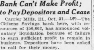 Bank Can't Make Profit; to Pay Depositors and Cease Carrier Mills, III., Oct. Citizens Savings bank here, with resources of $50,603, has voluntary liquidation of failure to earn sufficient profit to remain in business. been asked to call for their money.
