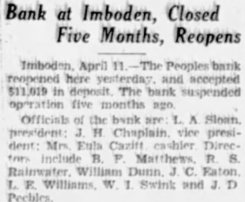 Bank at Imboden, Closed Five Months, Reopens Imboden April 11 The Peoples bank reopened here yesterday and accepted $11,019 in deposit The bank suspended five months ago Officials of the bank are L. A Slown. president: J Chaplain vice president: Mrs Eula Cazift cashier Direcinclude R S. Swink and J. D