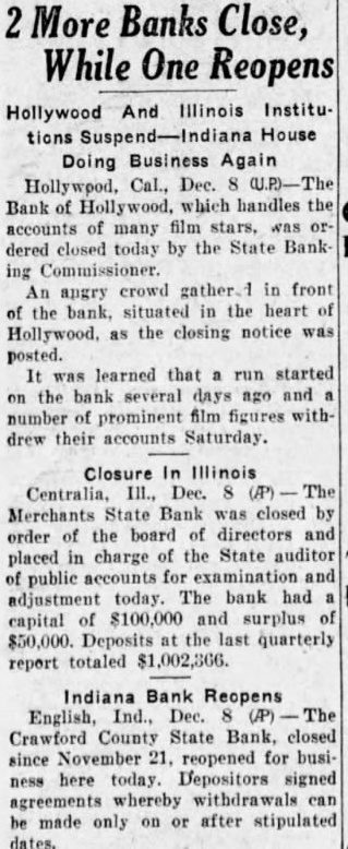 More Banks Close, While One Reopens Hollywood And Illinois Institutions Suspend-Indiana House Doing Business Again Hollywood, Cal., Dec. Bank of Hollywood, which handles the accounts of many film stars, ordered closed today by the State Bank ing Commissioner. An angry crowd gather. in front of the bank, situated in the heart of Hollywood, as the closing notice was posted. It was learned that run started the bank several days ago and number of prominent film figures withdrew their accounts Saturday. Closure In Illinois Centralia. III., Dec. The Merchants State Bank closed by order of the board of directors and placed in charge of the State auditor public accounts for and adjustment today. The bank had capital of $100,000 and surplus of $50,000. Deposits at the last quarterly report totaled $1,002,366. Indiana Bank Reopens English, Ind., Dec. Crawford County State Bank, closed since November 21, reopened for business here today. Depositors signed agreements whereby withdrawals can be made only on or after stipulated dates.